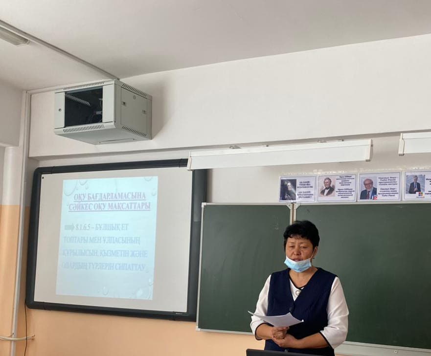 Жас мамандарға әдістемелік көмек беру мақсатында биология пәні мұғалімі, педагог-зерттеуші Т.Жунуспаева қысқа мерзімді жоспар құру үлгісін, сабақта қолданылатын белсенді әдіс-тәсілдерді көрсетіп өтті.