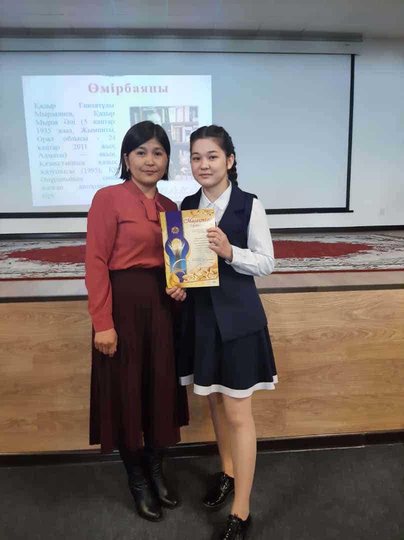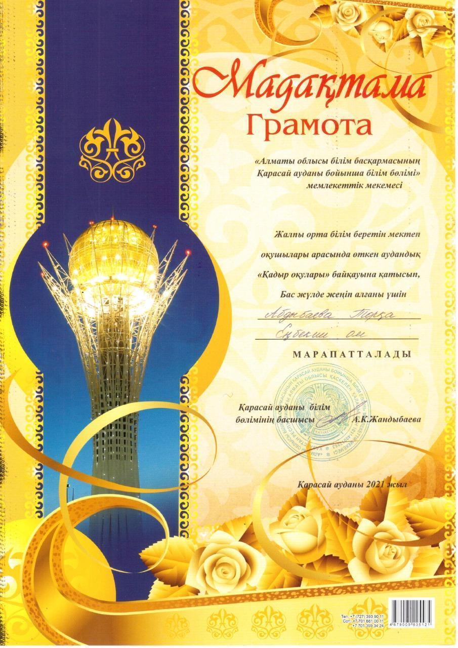 Жалпы орта білім беретін мектеп оқушылары арасында өткен аудандық "Қадыр оқулары" байқауына қатысып, мектебіміздің 8А сынып оқушысы Абдыбаева Торқа Бас жүлде жеңіп алды. Жетекшісі: Арыкова Г.Е.
