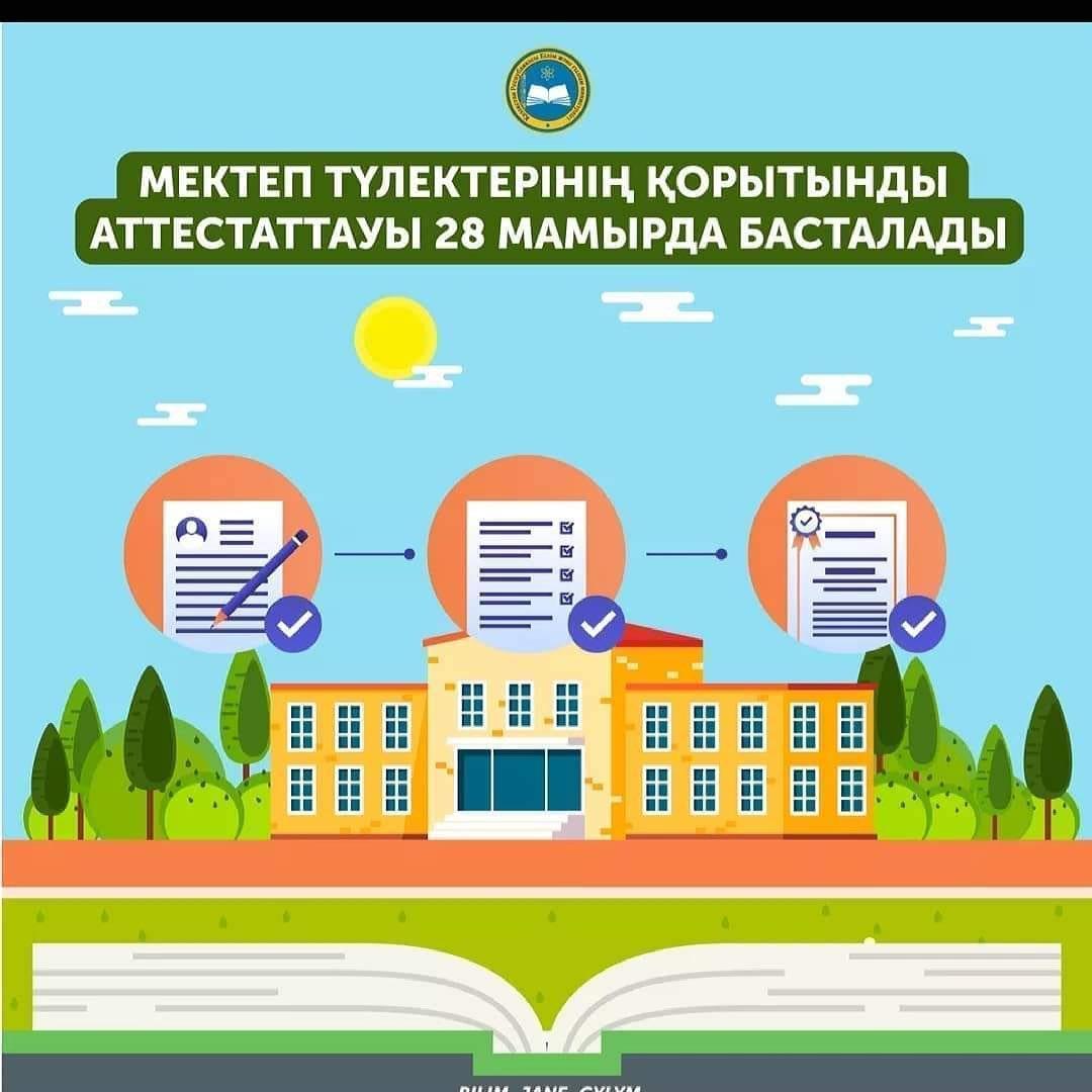 🖌9 (10) сынып оқушыларының қорытынды бітіру емтихандары 2021 жылғы 28 мамыр мен 5 маусым аралығында өтеді. Олар қорытынды аттестаттауды үш пән бойынша тапсырады: оқыту тілі бойынша эссе нысанында жазбаша емтихан; математикадан (алгебрадан) жазбаша емтихан; өзге тілдерде оқитын сыныптарда қазақ тілі мен әдебиеті бойынша жазбаша емтихан және қазақ тілінде оқытатын сыныптардағы орыс тілі мен әдебиеті бойынша жазбаша емтихан.