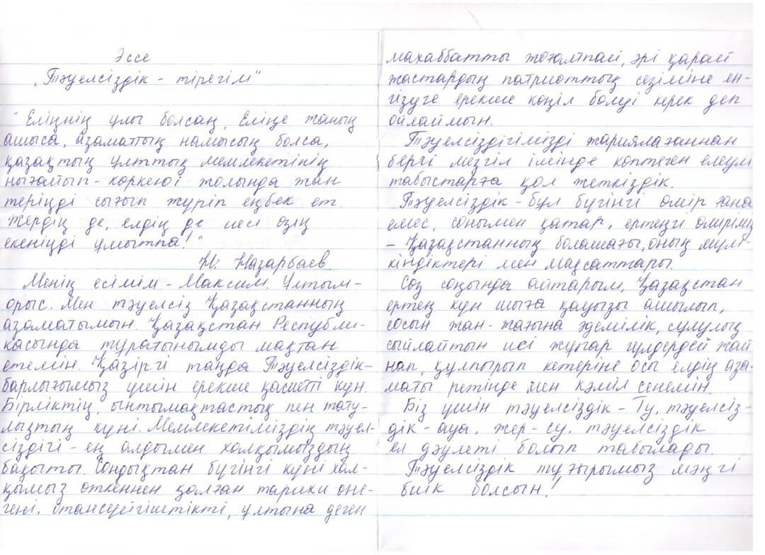 Қазақстан халқы Ассамблеясы "Жетісу дарыны" орталығымен бірлесіп ҚР Тәуелсіздігінің 30 жылдығына арналған «Тәуелсіздік-тірегім» тақырыбында өзге ұлт өкілдері оқушыларына арналған эссе байқауына қатысушы "Еңбекші ауылындағы орта мектеп" КММ 7 "В" сынып оқушысы Тупицын Максимнің "Тәуелсіздік - тірегім" тақырыбындағы эссе жұмысы.