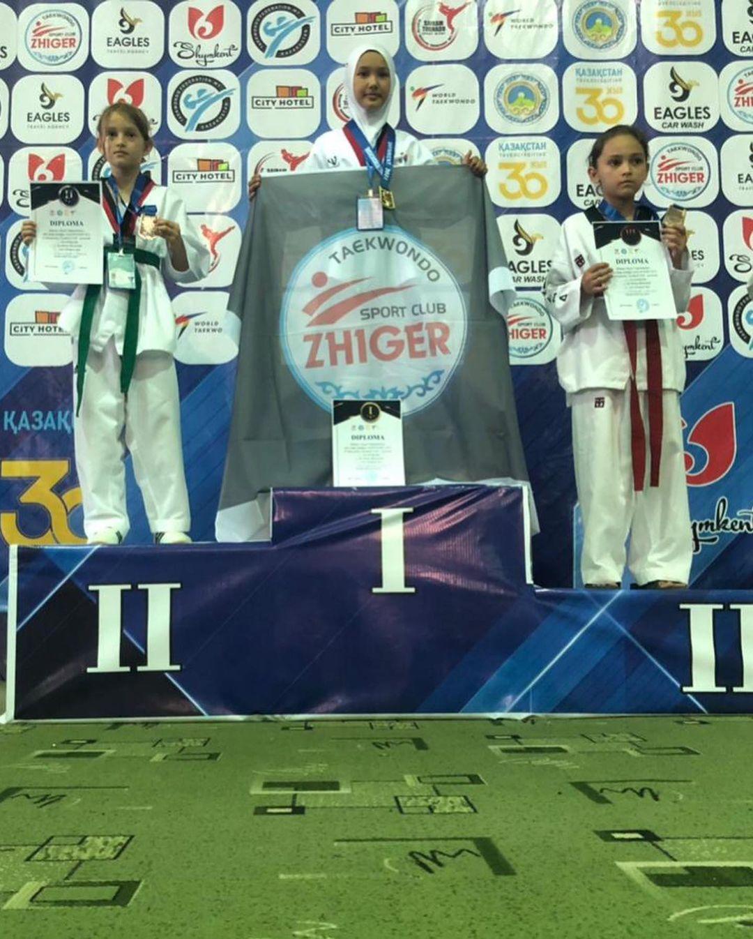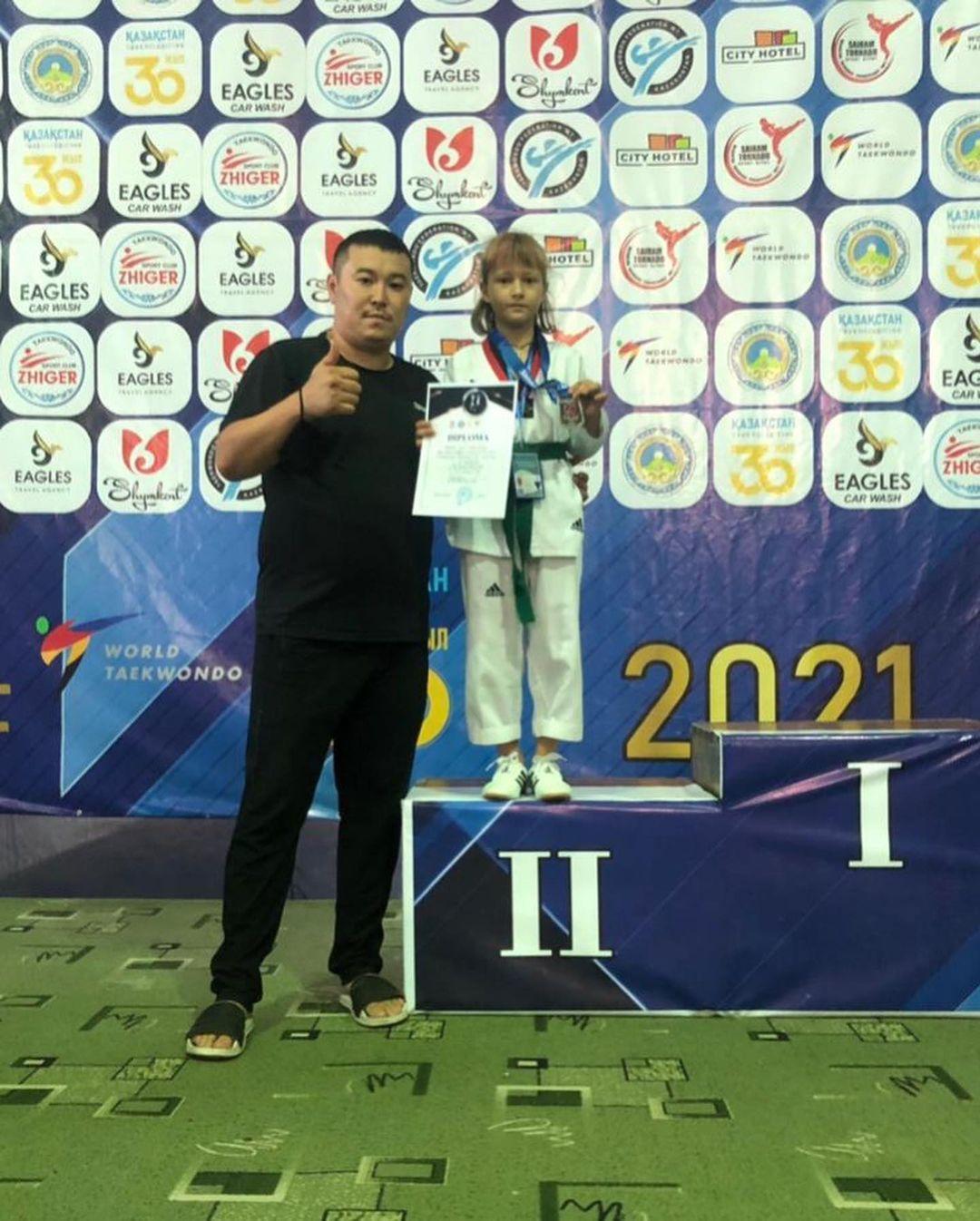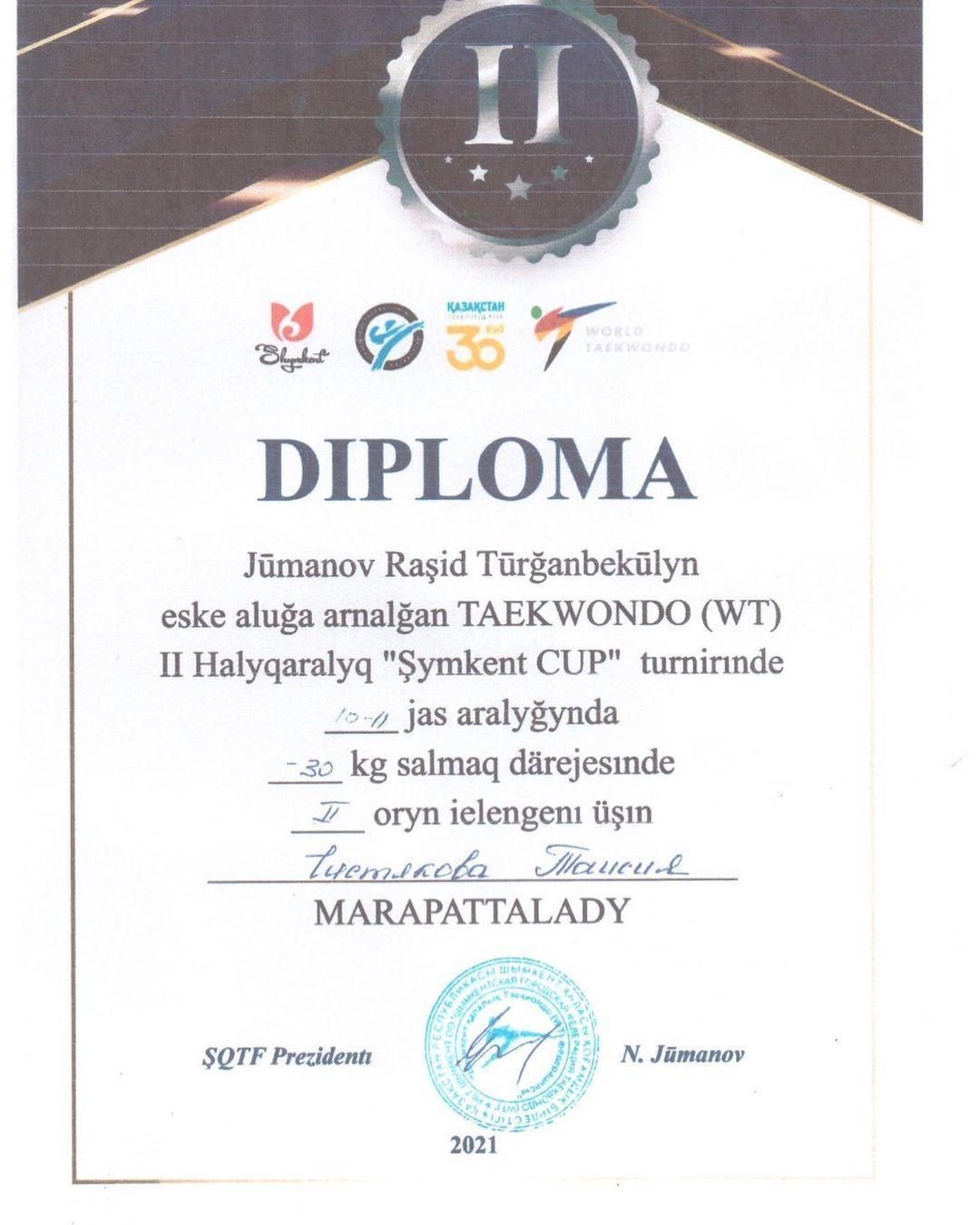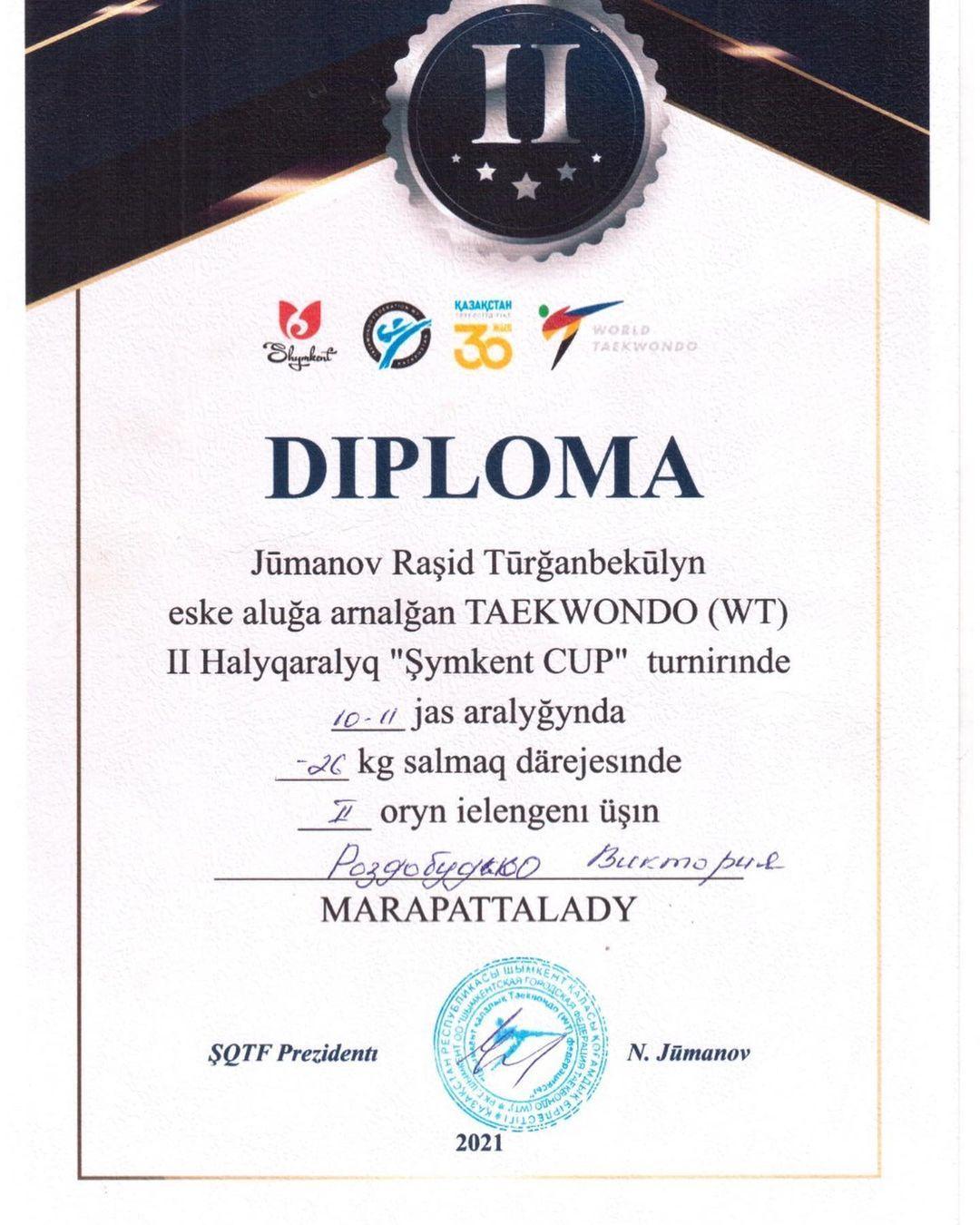 Жуманов Рашид Тұрғанбекұлын еске алу күніне орай Таеквондодан ІІ Халықаралық "Shymkent CUP" турнирінде 10-11 жас аралығында 26 кг және 30 кг салмақ дәрежесінде мектебіміздің 5 “Г” сынып оқушылары Роздобудько Виктория және Чистякова Таисия ІІ орынды иеленді