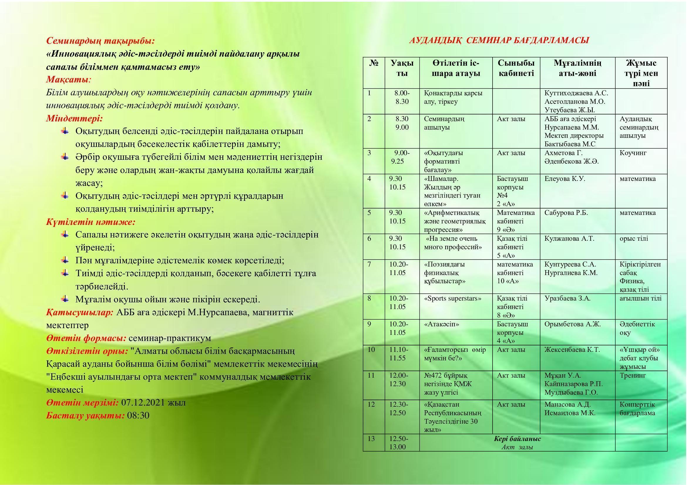 2021 жылдың 7 желтоқсан күні Еңбекші ауылындағы орта мектеп базасында магниттік мектептер мен серіктес мектептерге "Инновациялық әдіс-тәсілдерді тиімді пайдалану арқылы сапалы біліммен қамтамасыз ету" тақырыбында аудандық семинар-практикумында сабақ берген ұстаздар
