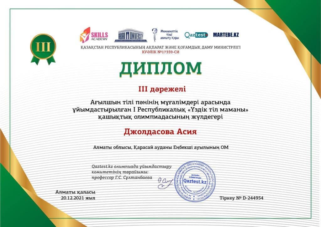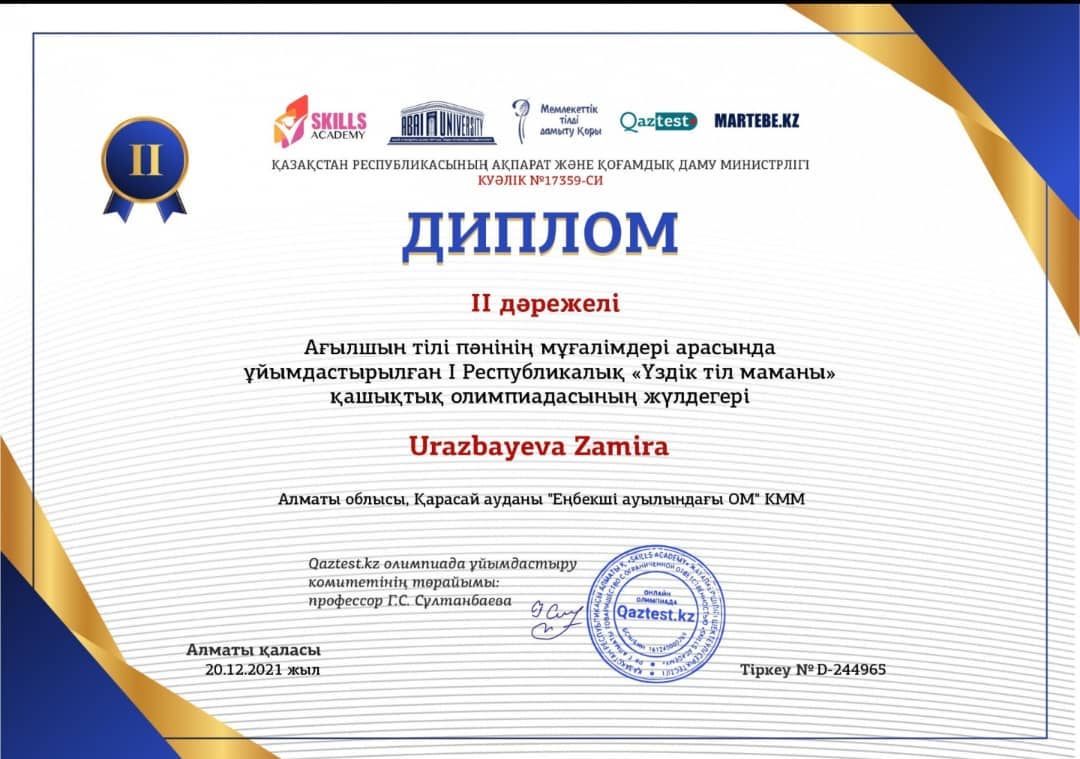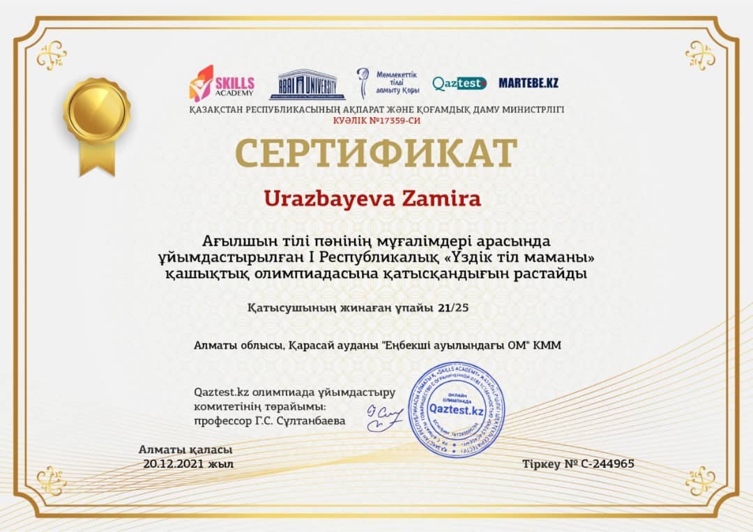 22 декабрь 2021 0 1 2 3 4 5 Ағылшын пән мұғалімдерінің жеңімпаздары Ағылшын тілі пәнінің мұғалімдері арасында ұйымдастырылған І Республикалық "Үздік тіл маманы" қашықтық олимпиадасына қатысып Уразбаева З.А. мен Джолдасова А.А. дәрежелі диплом және сертификатпен марапатталды.