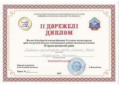 Жалпы білім беретін пәндер бойынша 5-6 сынып оқушыларына арналған республикалық олимпиаданың үшінші (аудандық) кезеңінде ІІ орын иеленгені үшін 5«Г» сынып оқушысы Айдарұлы Алихан (мұғалімі Амантаева Э.Т.) мен ІІІ орын иеленгені үшін 6 “В” сынып оқушысы Махсет Медет (мұғалімі Сайбеков А.С.)дәрежелі дипломмен марапатталды.