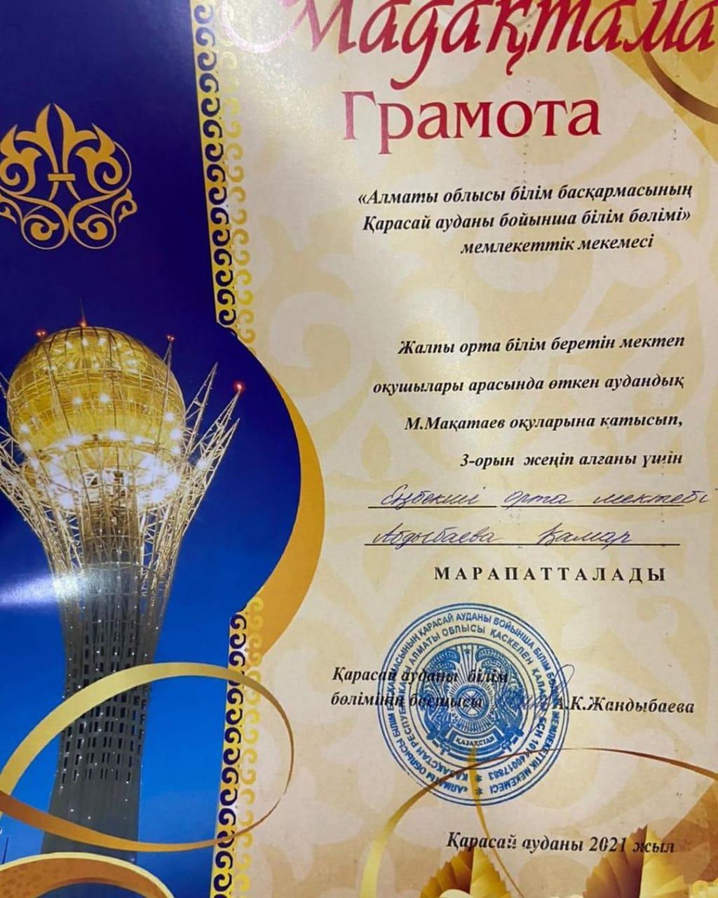 19.02.2021ж. күні аудандық “Мұқағали Мақатаев оқулары” сайысы өтті. Мектебіміздің 10-сынып оқушысы Абдыбаева Қамар қатысып, ІІІ-орынды қанжығасына байлады. Жетекшісі: Қанатова Т.Қ.