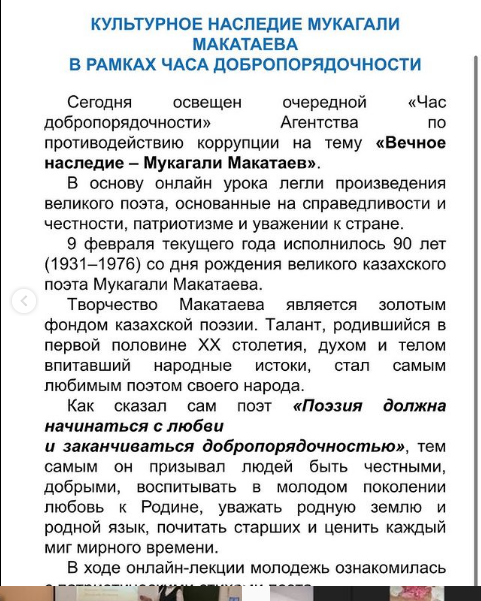 08 февраль 2021 0 1 2 3 4 5 Ақиық ақын Мұқағали Мақатаевтың туған күніне орай “Адалдық сағаты” өтті.