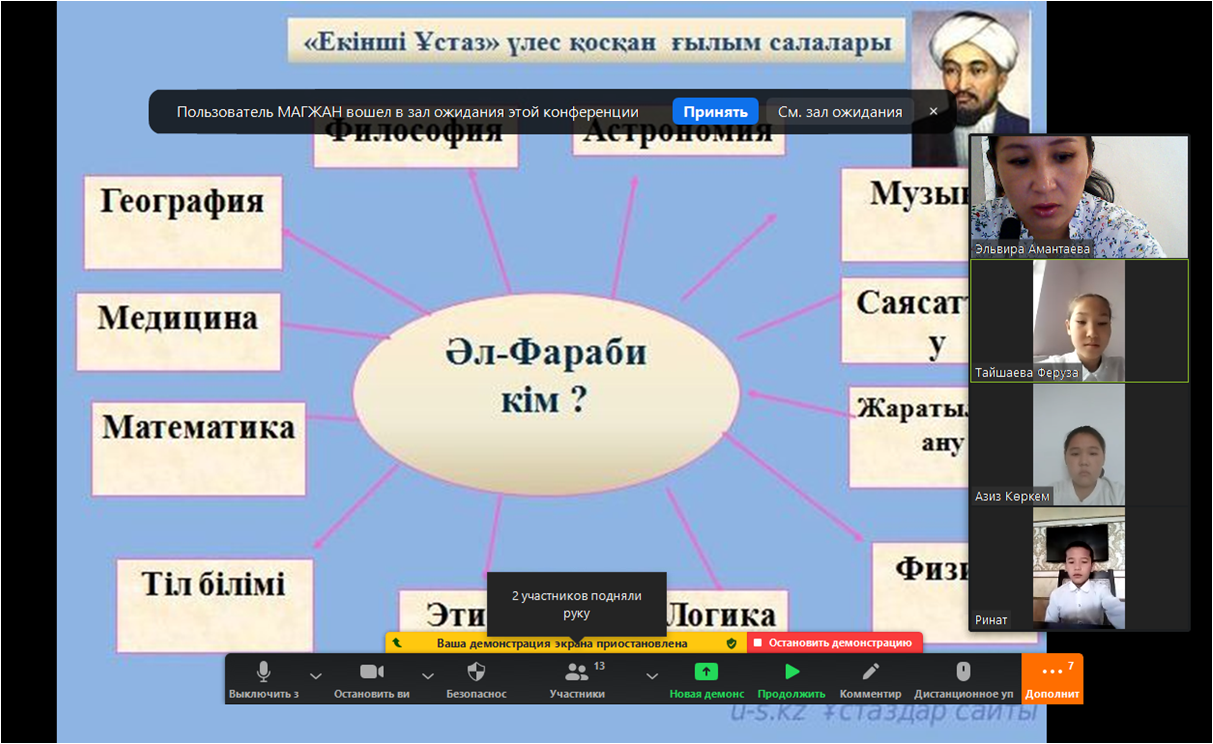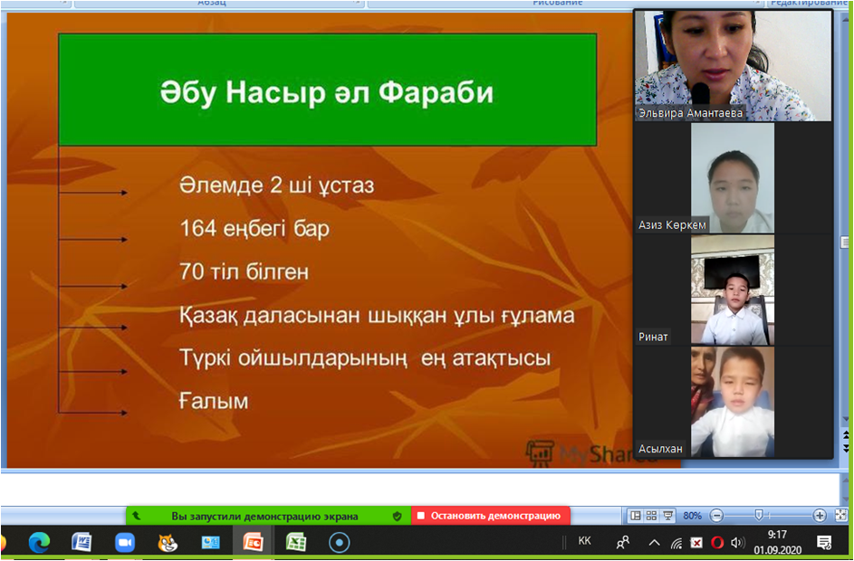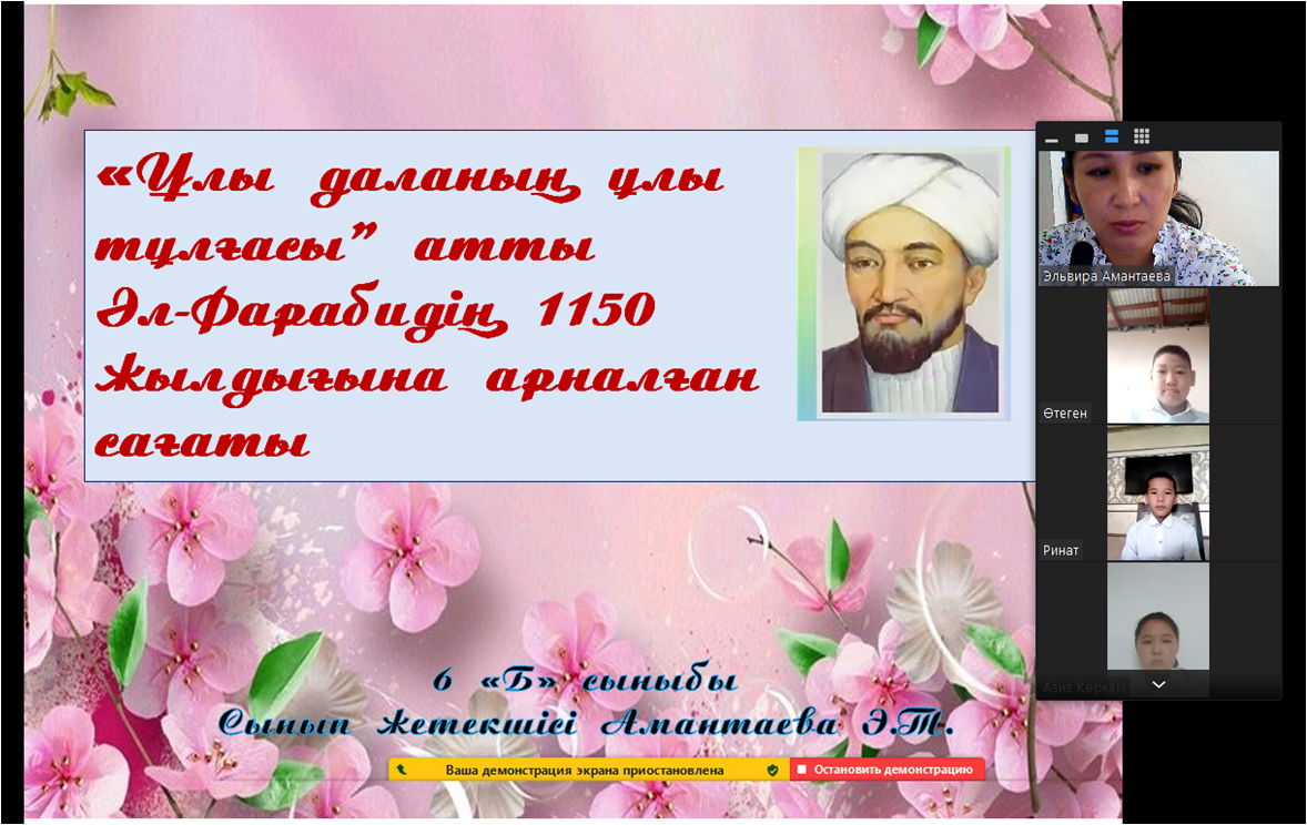 Әбу Насыр Әл-Фарабидің 1150 жылдығына орай 6 Б сынып оқушыларының қатысуымен "Ұлы даланың ұлы тұлғасы" атты ашық тәрбие сағаты өтті.