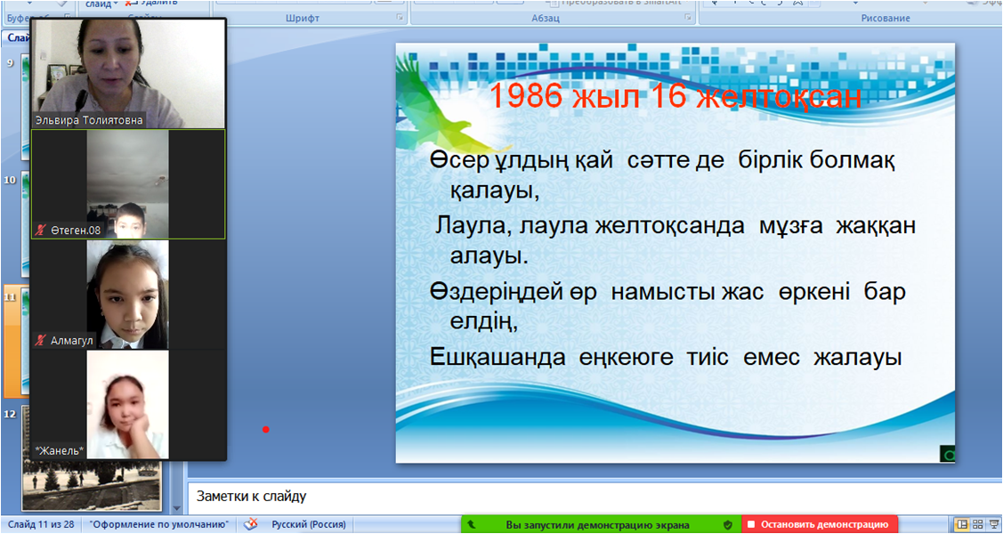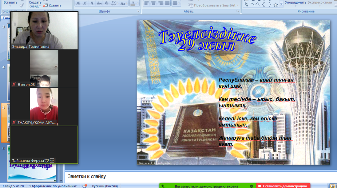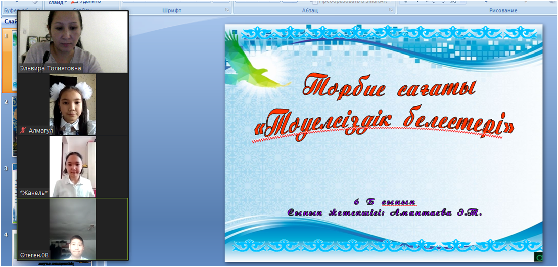 15 декабрь 2020 0 1 2 3 4 5 16 желтоқсан – Тәуелсіздік күніне арналған тәрбие сағаты өтті. 16 желтоқсан – Тәуелсіздік күніне орай 6 "Б" сынып оқушыларының қатысумен "Тәуелсіздік белестері" атты ашық тәрбие сағаты өтті. Сынып жетекшісі Амантаева Э.Т.