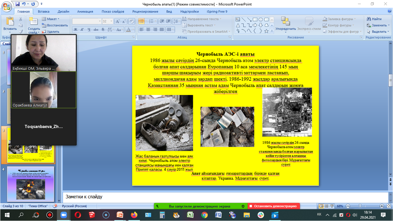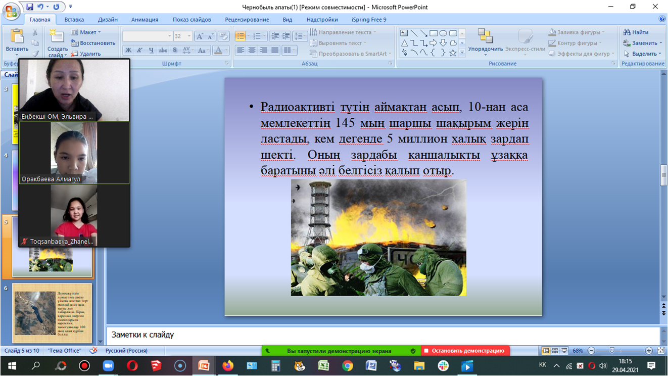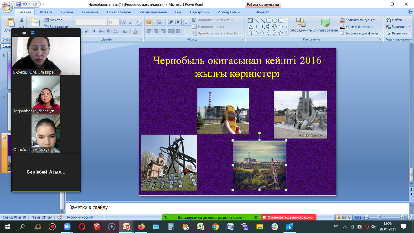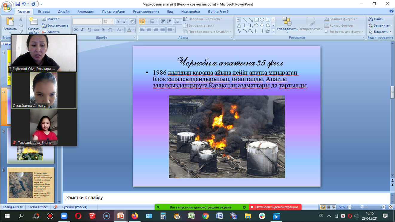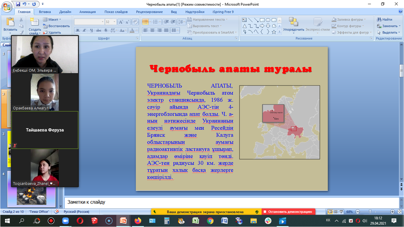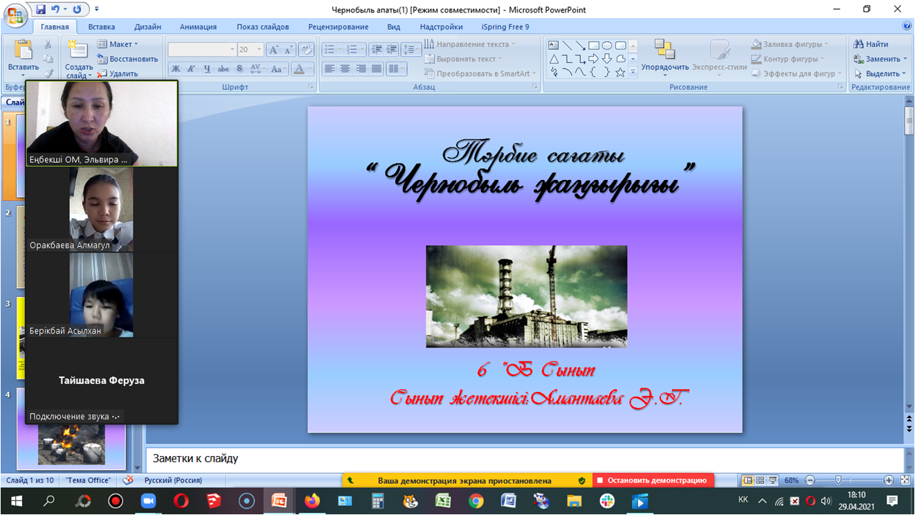 Чернобыль апатының - 35 жылдығына орай 6”б” сынып оқушыларының қатысуымен “Чернобыль жаңғырығы” атты тақырыпта сынып сағатын өтті. Сынып жетекшісі: Амантаева Э.Т.