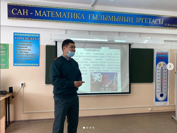“Экстремизм және терроризмнің ұлттық қауіпсіздікке тигізетін салдары” тақырыбында алғашқы әскери және техникалық дайындық пәнінің мұғалімі Хамраханұлы Н. 9 сыныптар арасында сыныптан тыс тәрбие сағатын өткізді.