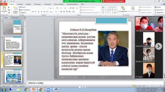 27.01.2022 ж. "Менің кәсіби өсуімдегі тәлімгер көмегі" тақырыбындағы жас мұғалімдер мен тәлімгерлердің біріккен жұмыстары онкүндігінің жоспарына сәйкес тәлімгер Кайпназарова Р.П. мен жас маман Мухаммедиярова Р.Ж. "Рәміздерім-мақтанышым" тақырыбында 8"Б" сынып оқушыларымен сайыс сабақ өткізді.