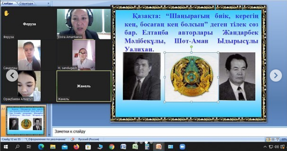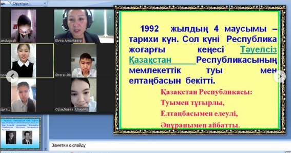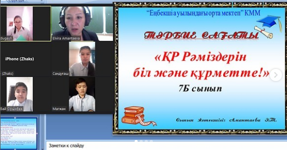 Қазақстан Республикасының Мемлекеттік Рәміздерін насихаттауға арналған іс-шаралар жоспарына сәйкес 7 “Б” сынып оқушыларымен ZOOM платформасы арқылы “ҚР Рәміздерін біл және құрметте!” тақырыбында ашық тәрбие сағаты өткізілді.