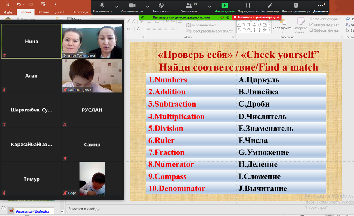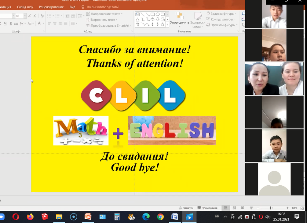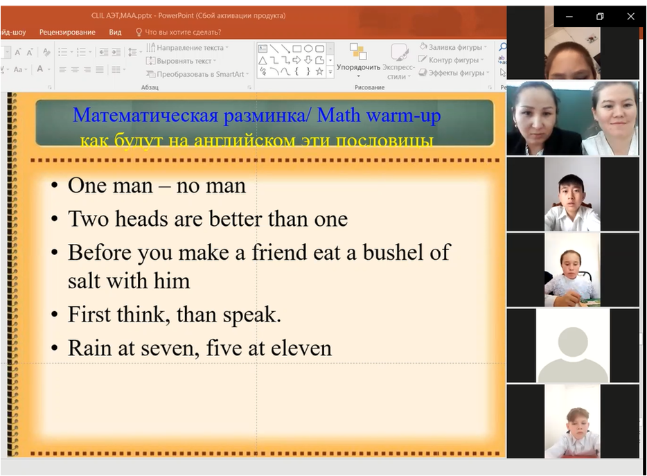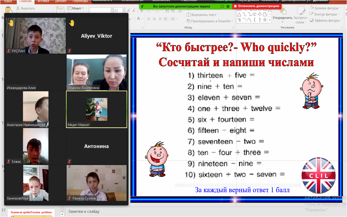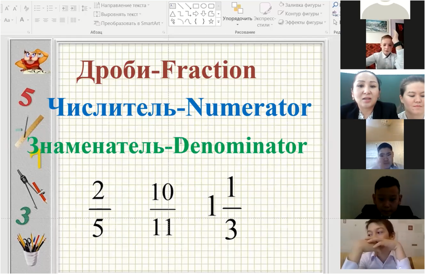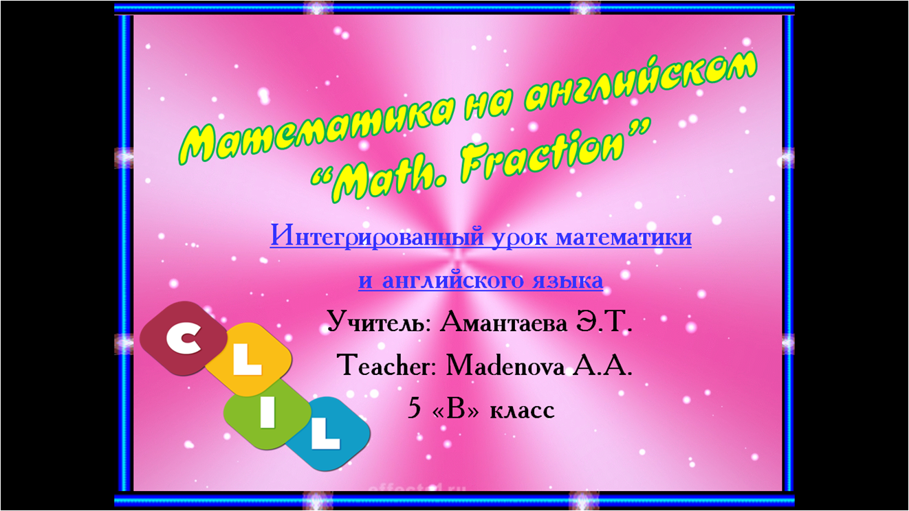 "Эрудит" жобасы бойынша 5 “В” сынып оқушыларының қатысуымен информатика пәнінің мұғалімі Амантаева Э.Т. мен ағылшын пәні мұғалімі Маденова А.бірлесіп "Clil:Math.Fractions" тақырыбында ашық сабақ өтті.