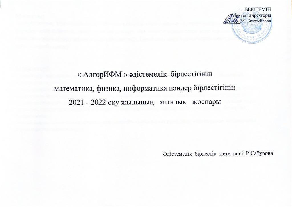 "АлгоИФМ" әдістемелік бірлестік жылдық, айлық жоспарлары 2021-2022 о.ж