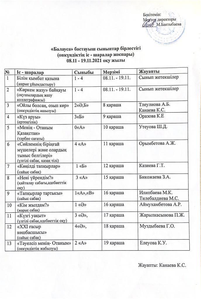 "Балауса" бастауыш сыныптар бірлестік онкүндік жоспары