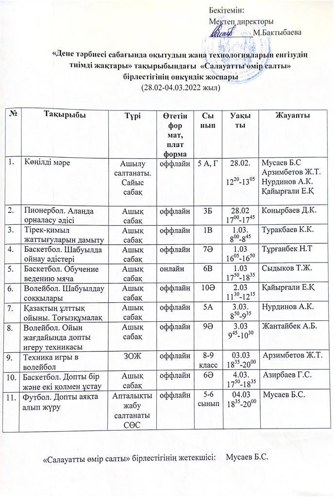 "Салауатты өмір салты" бірлестігінің онкүндік жоспары » Еңбекші ауылындағы ОМ