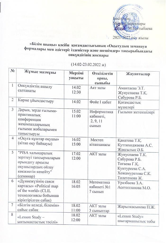 » » » "Білім шыңы" кәсіби қоғамдастығының онкүндік жоспары