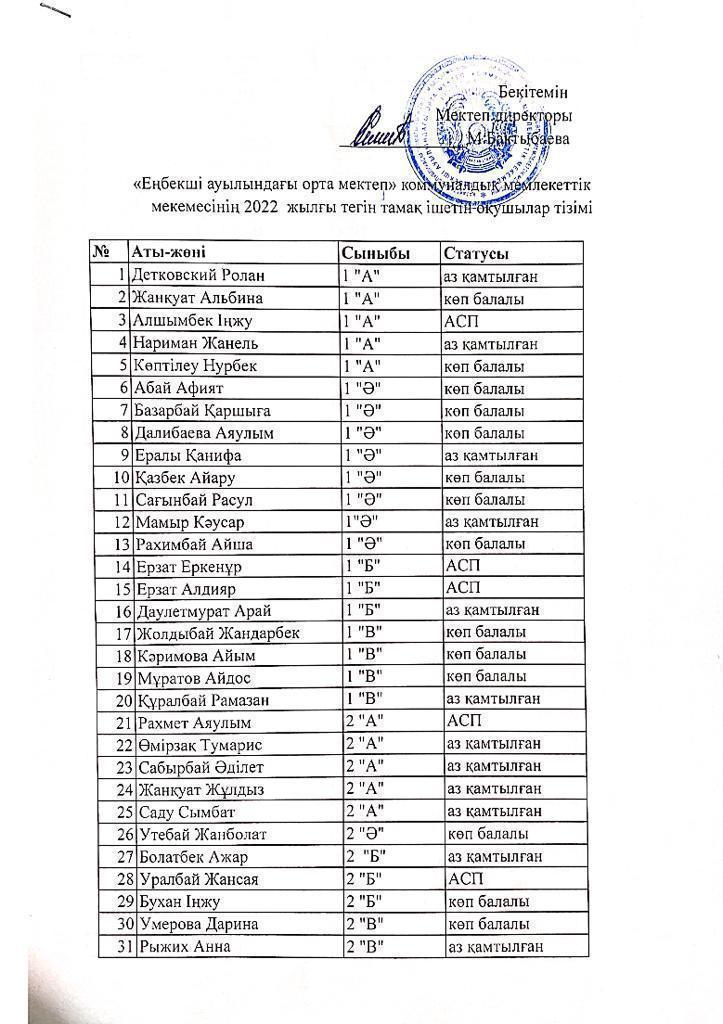 Тегін ыстық тамақ бойынша құжаттар (сұраныс, кесте, тізім) » Еңбекші ауылындағы ОМ