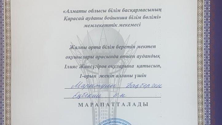 12 апрель 2021 0 1 2 3 4 5 Ілияс Жансүгіров оқуларына қатысып, І орынды Маратұлы Бақберген иеленді. Аудандық Ілияс Жансүгіров оқуларына қатысып, І орынды 7Б сынып оқушысы Маратұлы Бақберген иеленді.Жетекшісі: Нургалиева К.М.