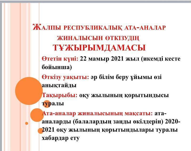 22.05.2021 ж. Жалпы республикалық ата-аналар жиналысы өтетінін хабарлаймыз!