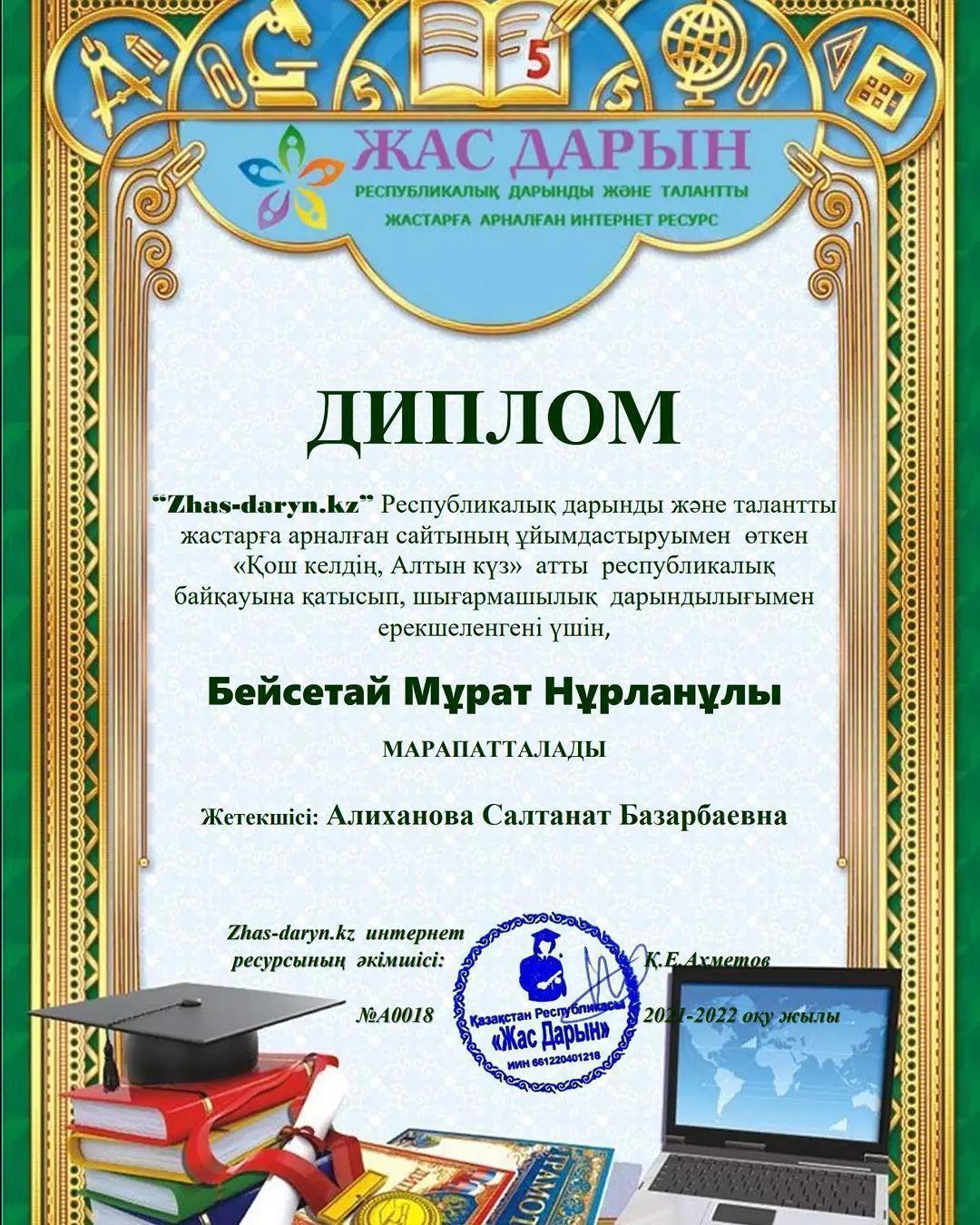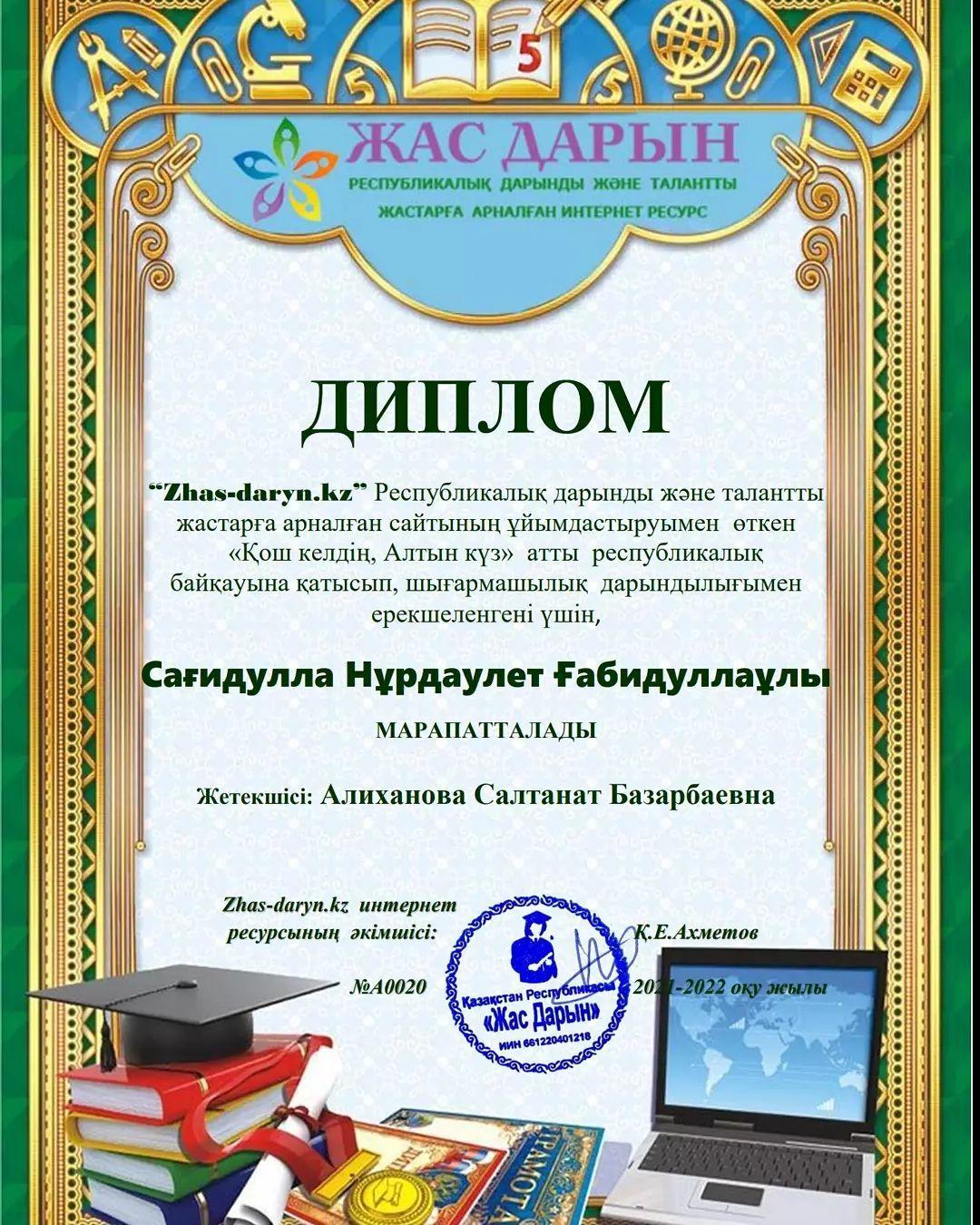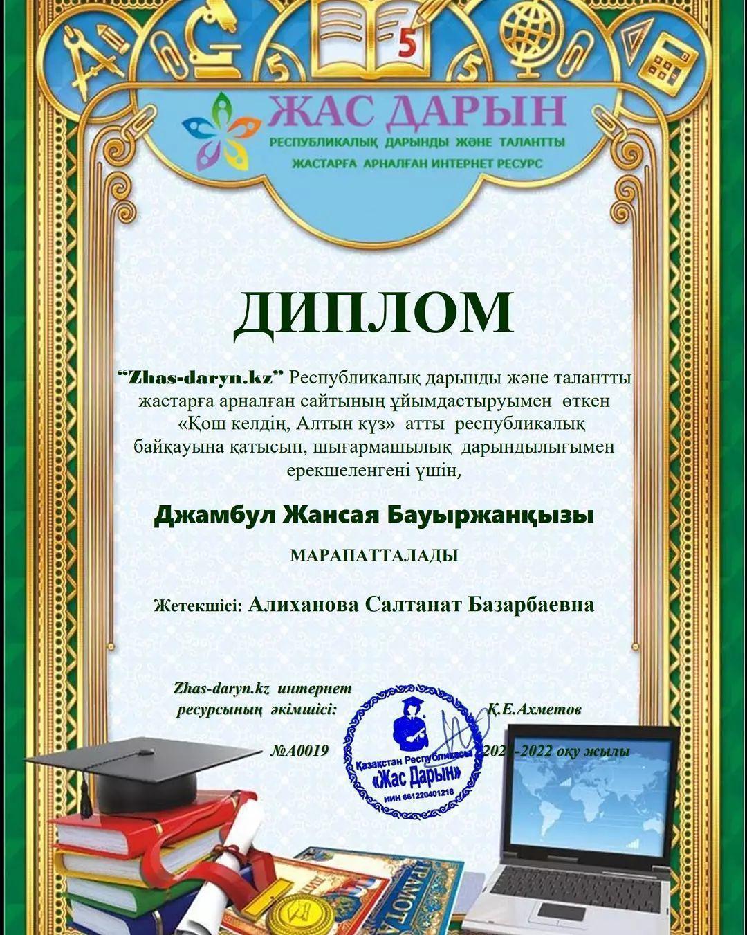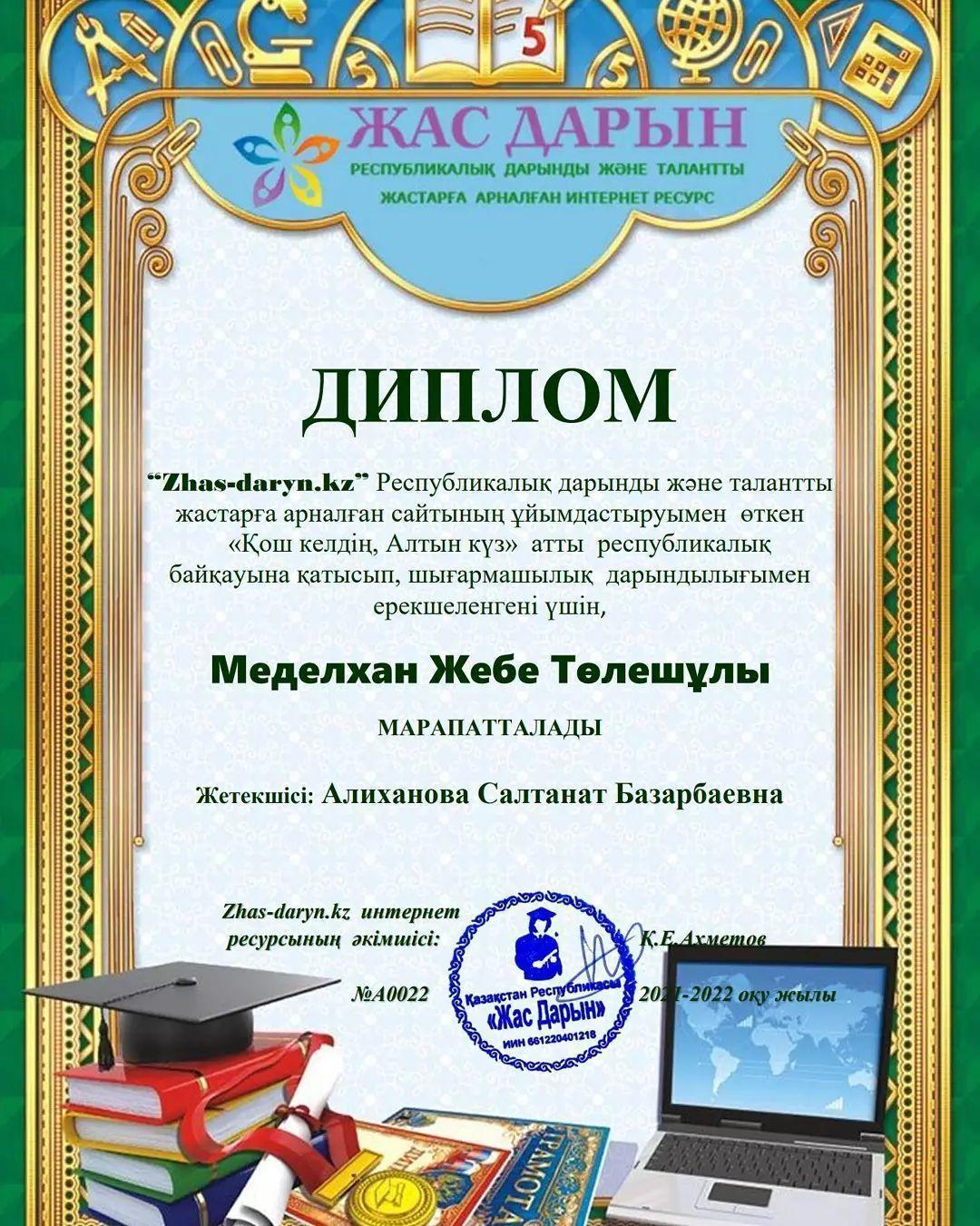"Zhas-daryn.kz" Республикалық дарынды және талантты жастарға арналған сайтының ұйымдастыруымен өткен "Қош келдің, Алтын күз" атты республикалық байқауына қатысып, шығармашылық дарындылығымен ерекшеленгені үшін Сағидулла Н.Ғ., Джамбул Ж.Б., Умырзақ Қ.Н., Меделхан Ж.Т., Бейсетай М.Н. дипломмен, жетекші мұғалімі Алиханова С.Б. құрмет грамотасымен марапатталды.