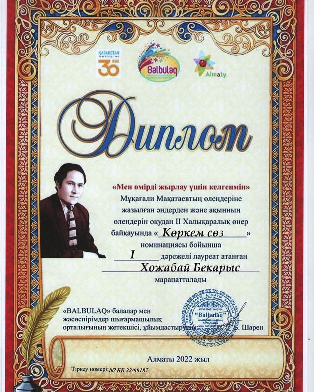 “Мен өмірді жырлау үшін келгенмін” тақырыбындағы ІІ Халықаралық өнер байқауында 2 “А” сынып оқушылары: Бақытжан Арман - бас жүлде,