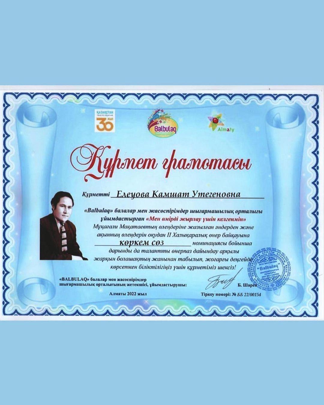 Жетекшісі: Елеуова К.У “Құрмет грамотасымен” марапатталды.