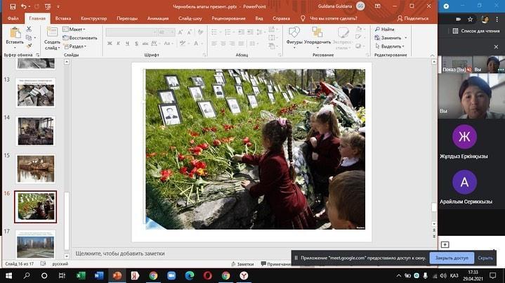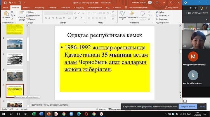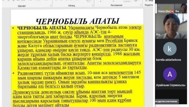 Чернобыль апатының - 35 жылдығына орай 8”а” сынып оқушыларының қатысуымен “Чернобыль апаты кеше, бүгін, ертең...” атты тақырыпта сынып сағаты өтті.