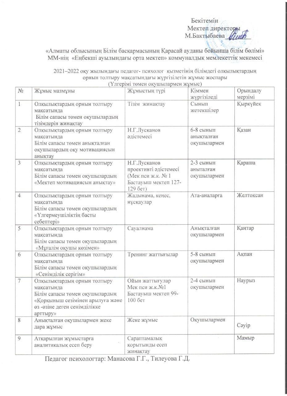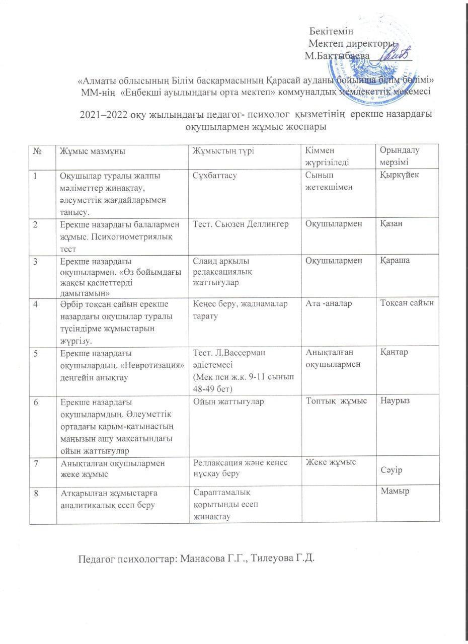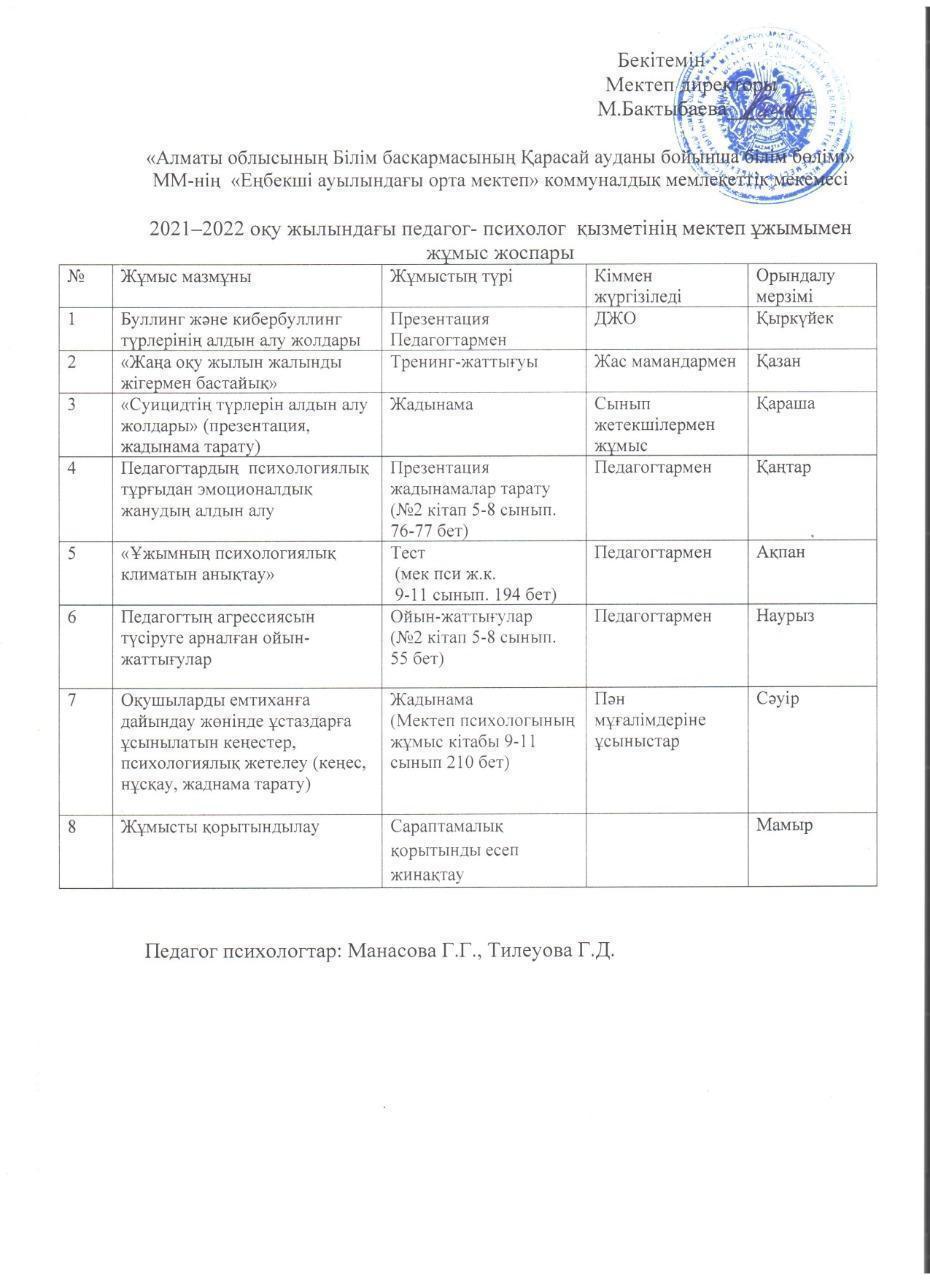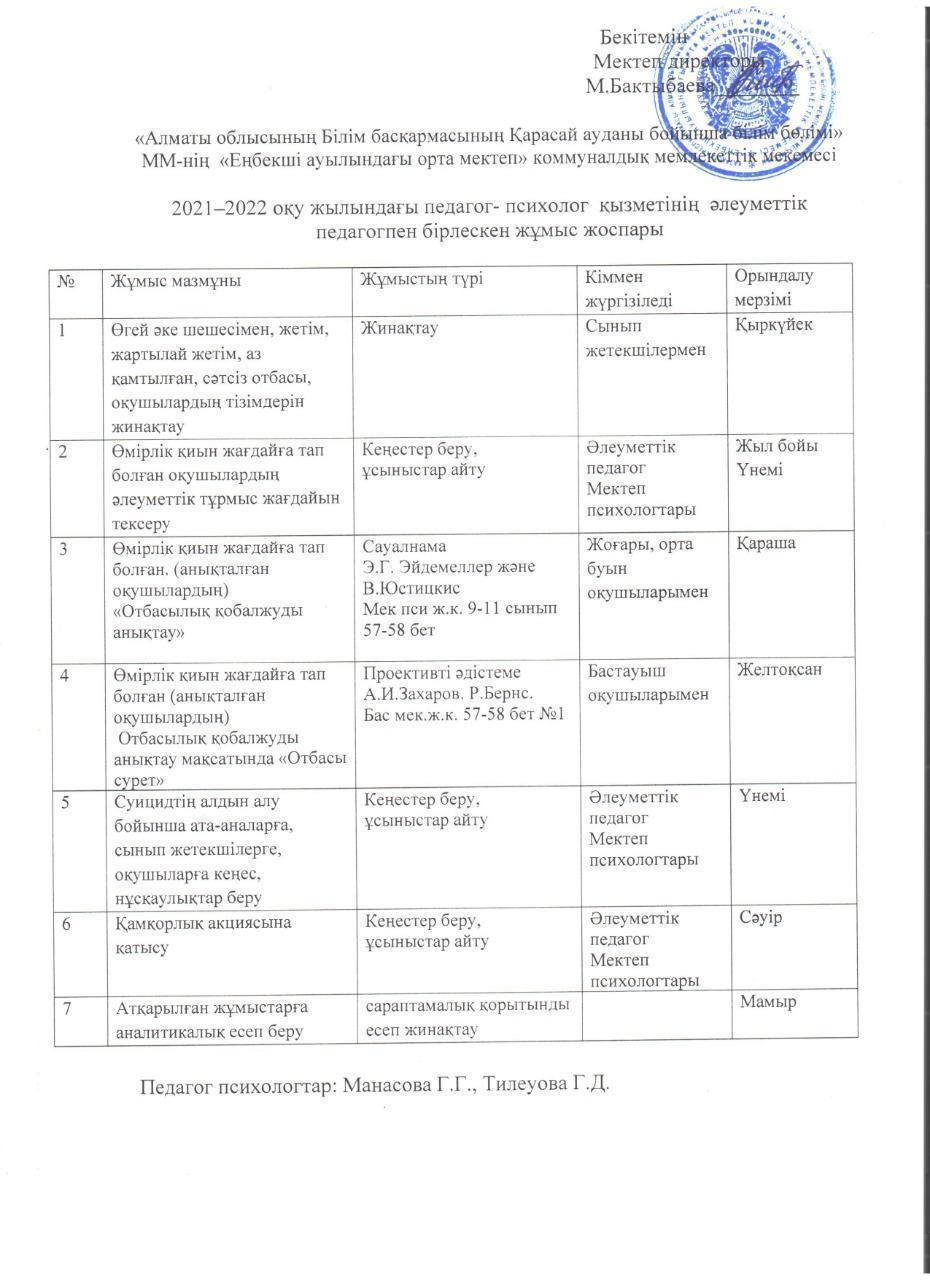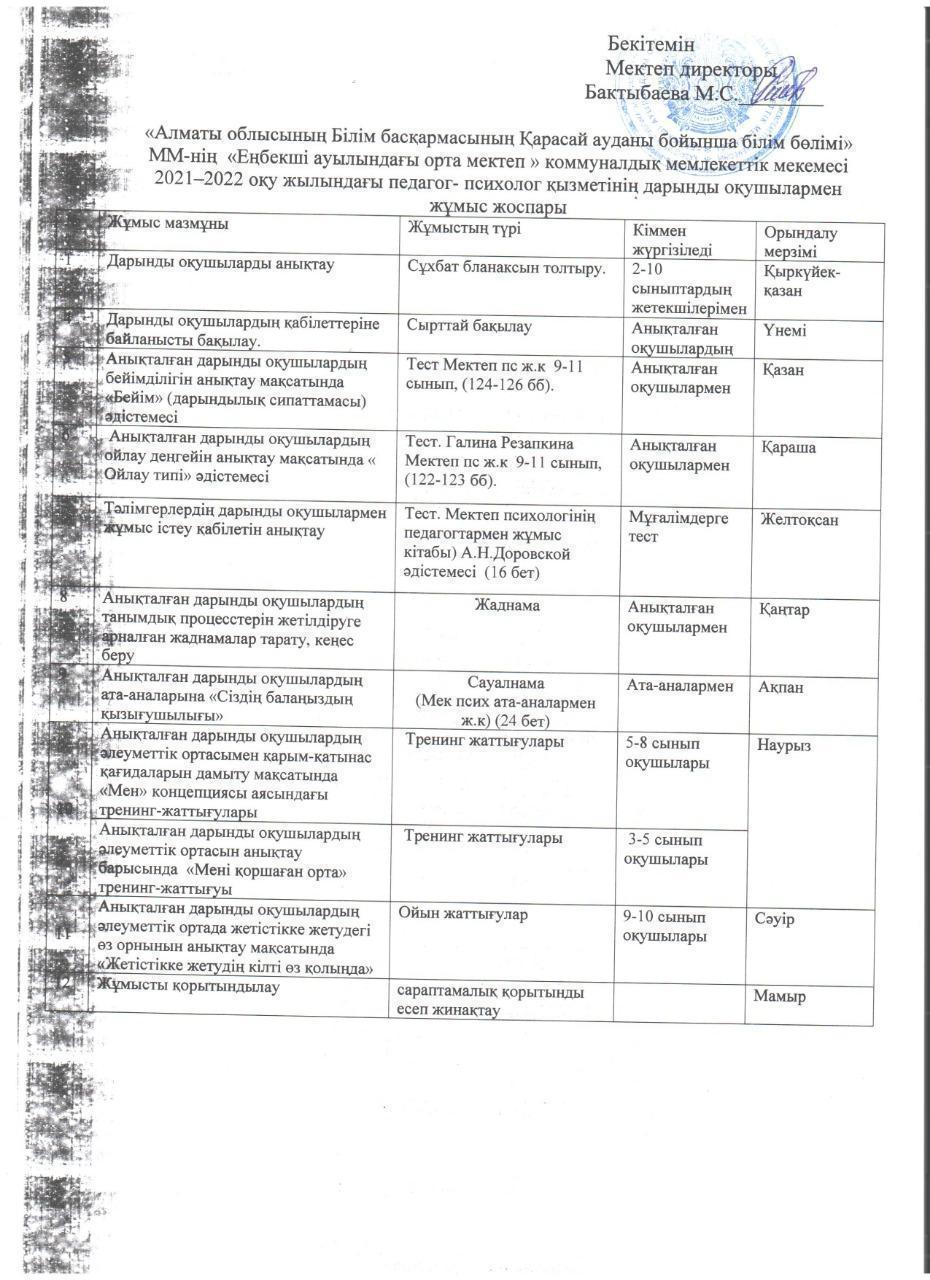 2021-2022 оқу жылындағы психолог жұмысының жоспарлары » Еңбекші ауылындағы ОМ