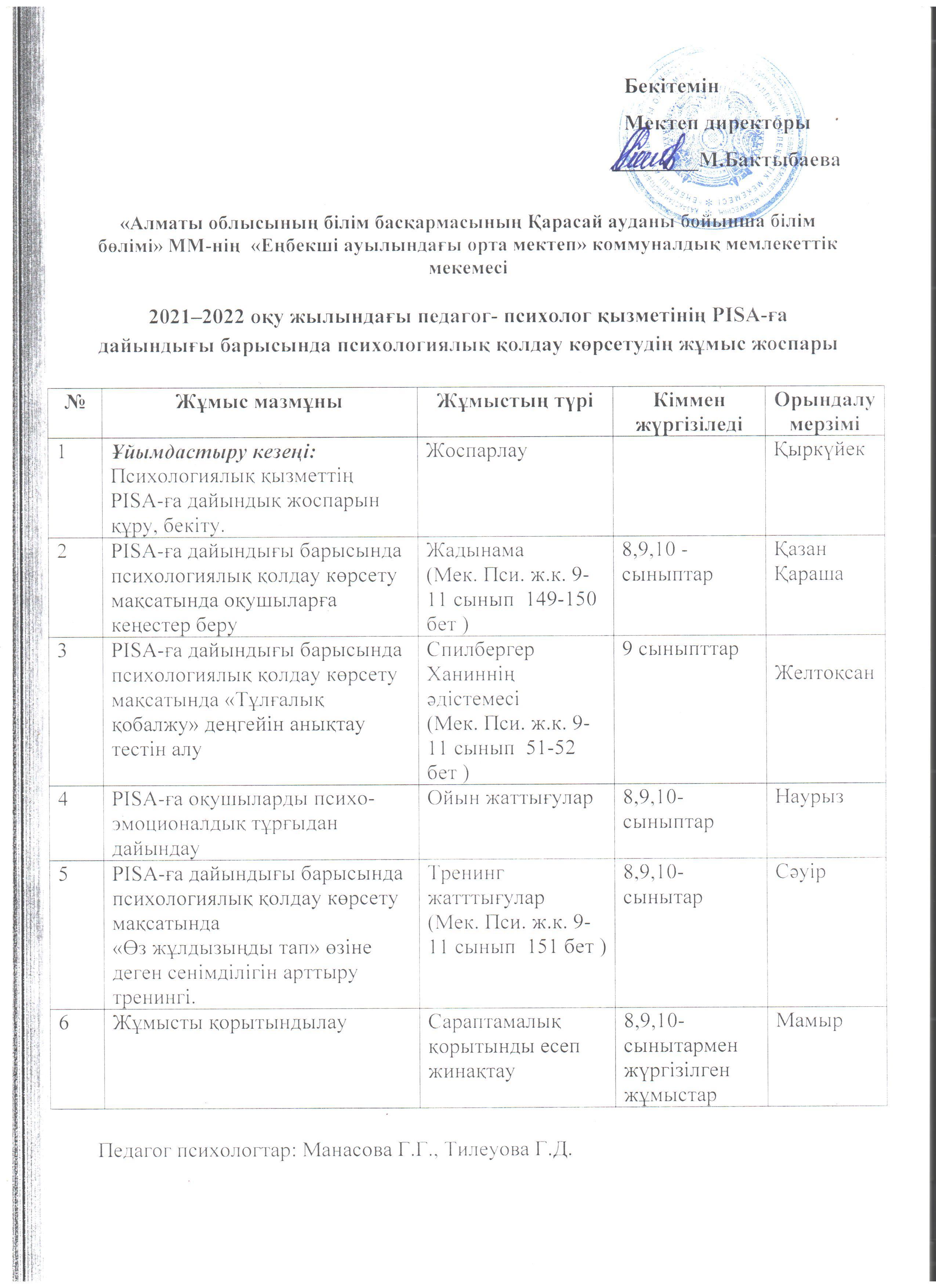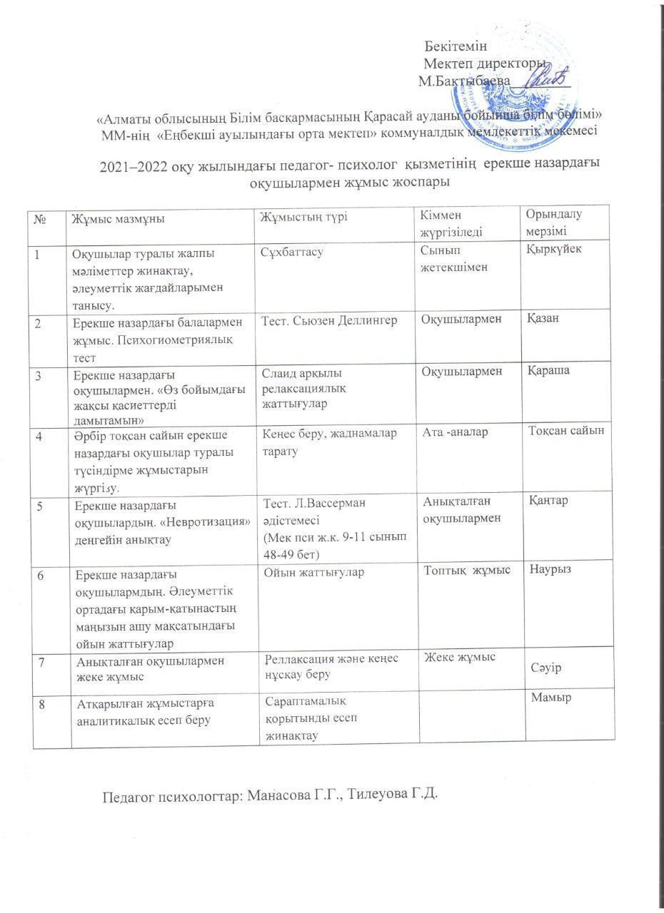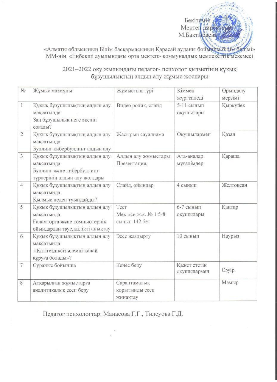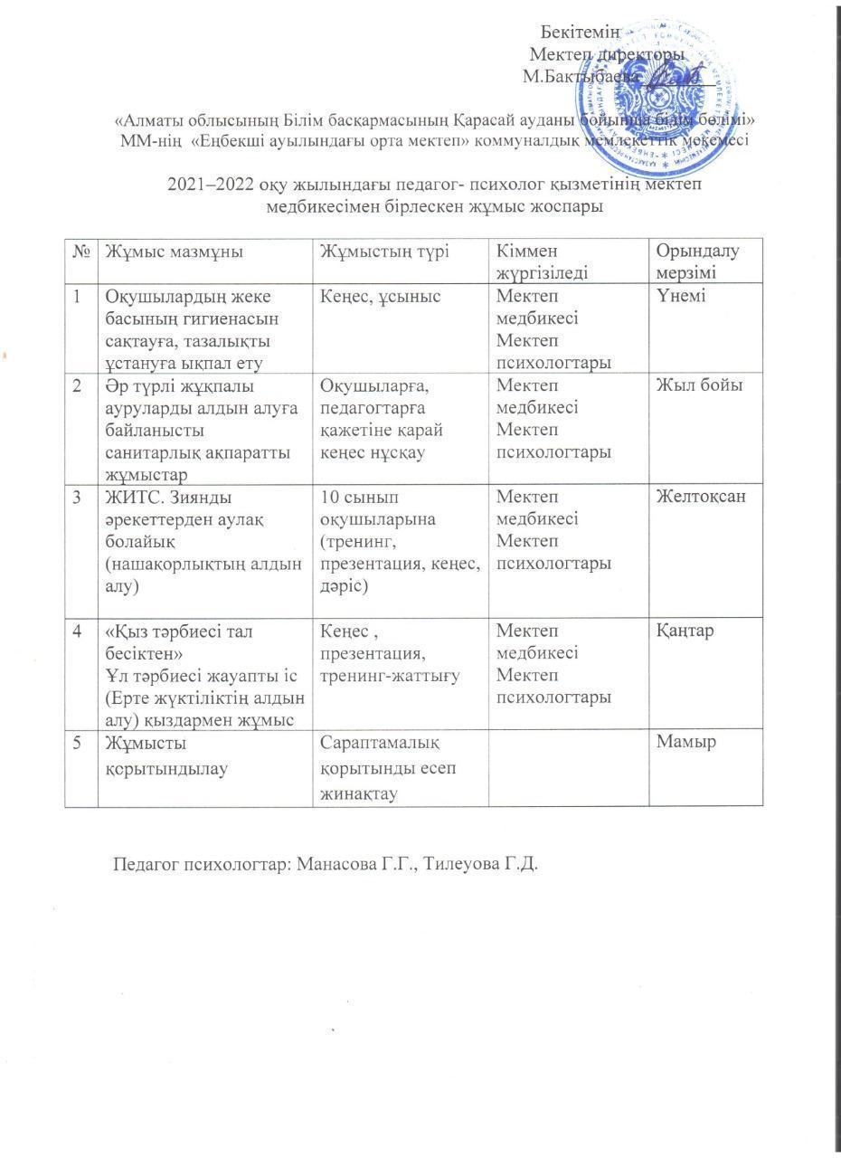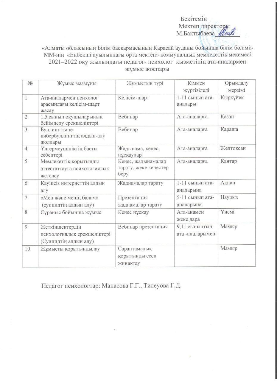 2021-2022 оқу жылындағы психолог жұмысының жоспарлары » Еңбекші ауылындағы ОМ