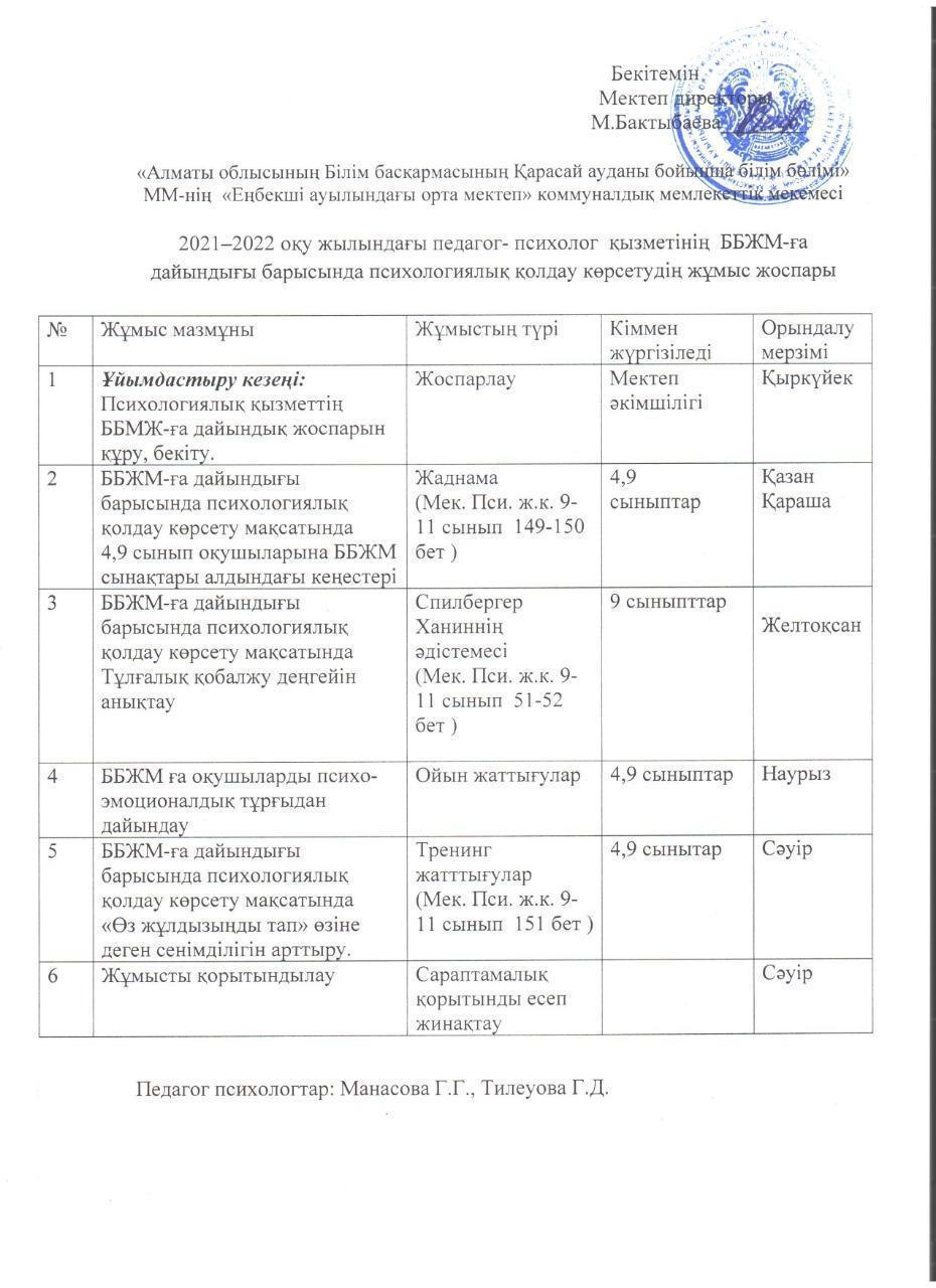 2021-2022 оқу жылындағы психолог жұмысының жоспарлары