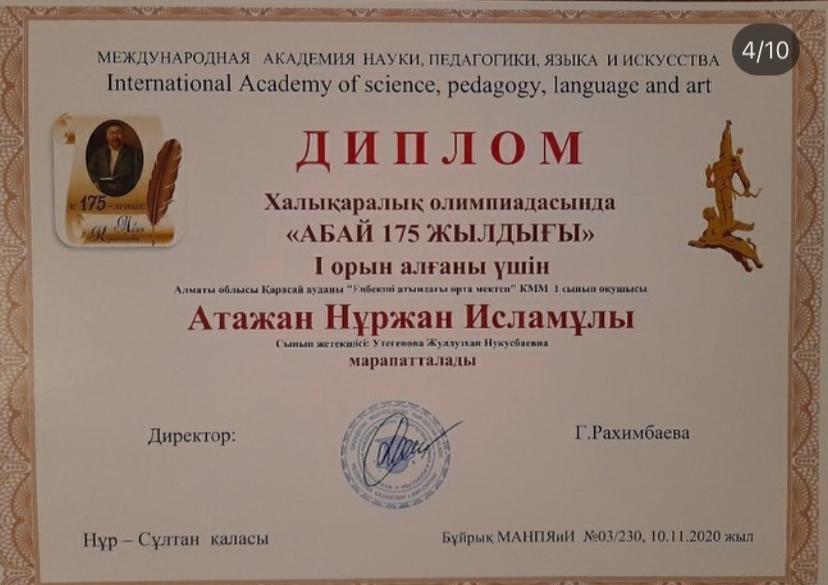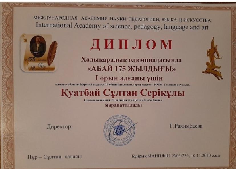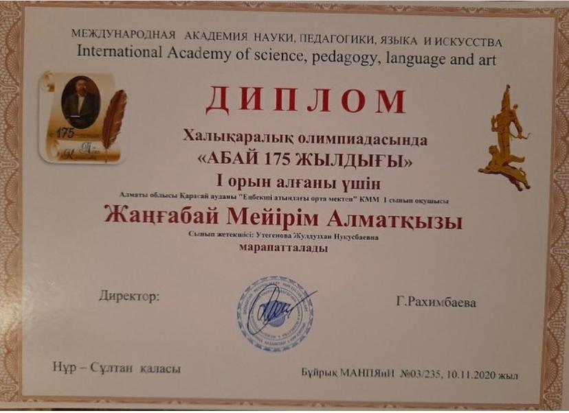 Абайдың 175 жылдығына орай өткізілген халықаралық олимпиада жеңімпаздары » Еңбекші ауылындағы ОМ