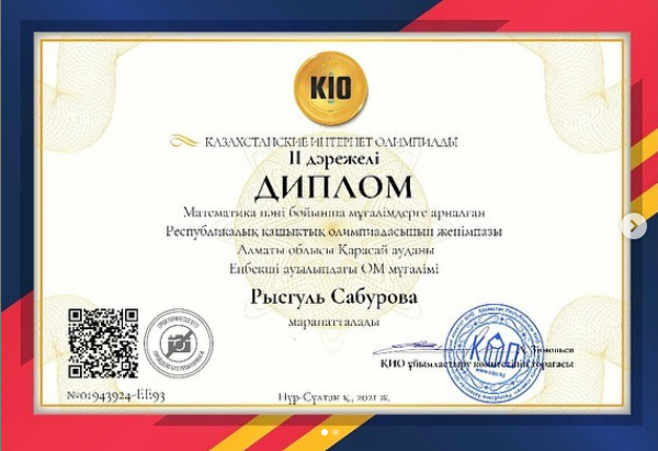 Математика пәні бойынша мұғалімдерге арналған Республикалық қашықтық олимпиадасына қатысып, ІІ дәрежелі орынды жеңіп алғаны үшін мектебіміздің математика пәнінің мұғалімі Сабурова Рысгуль марапатталды.