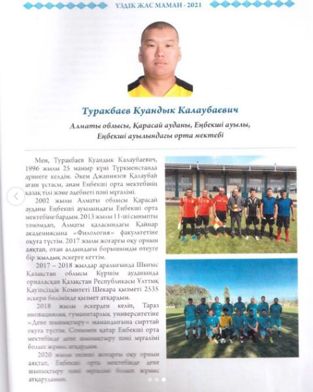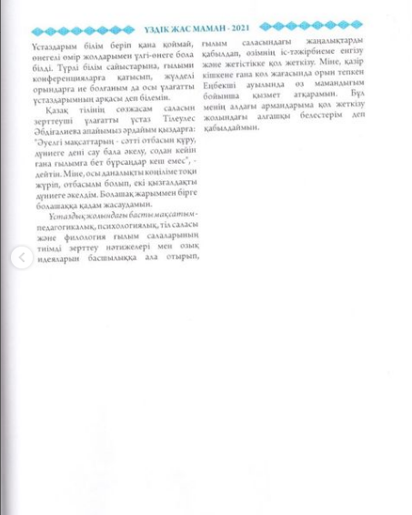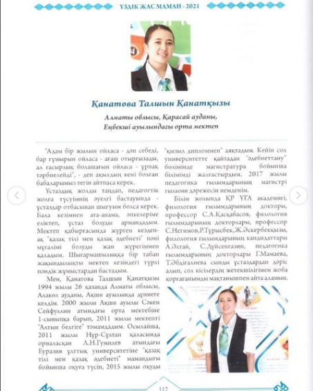 "BILIM-ORKENIETI" ұлттық инновациялық ғылыми-зерттеу орталығы ұйымдастырған Президент Қасым Жомарт Кемелұлы Тоқаевтың "Тәуелсіздік бәрінен қымбат" атты бағдарламалық мақаласын білім беру ұйымдарының педагогтары арасында кеңінен насихаттау мақсатында өткен "Үздік жас маман - 2021" атты республикалық байқауға мектебіміздің жас мамандары Қанатова Т.Қ. мен Туракбаев К.К. қатысып, жүлдегер атанып, "Үздік жас маман" төс белгісімен марапатталды.