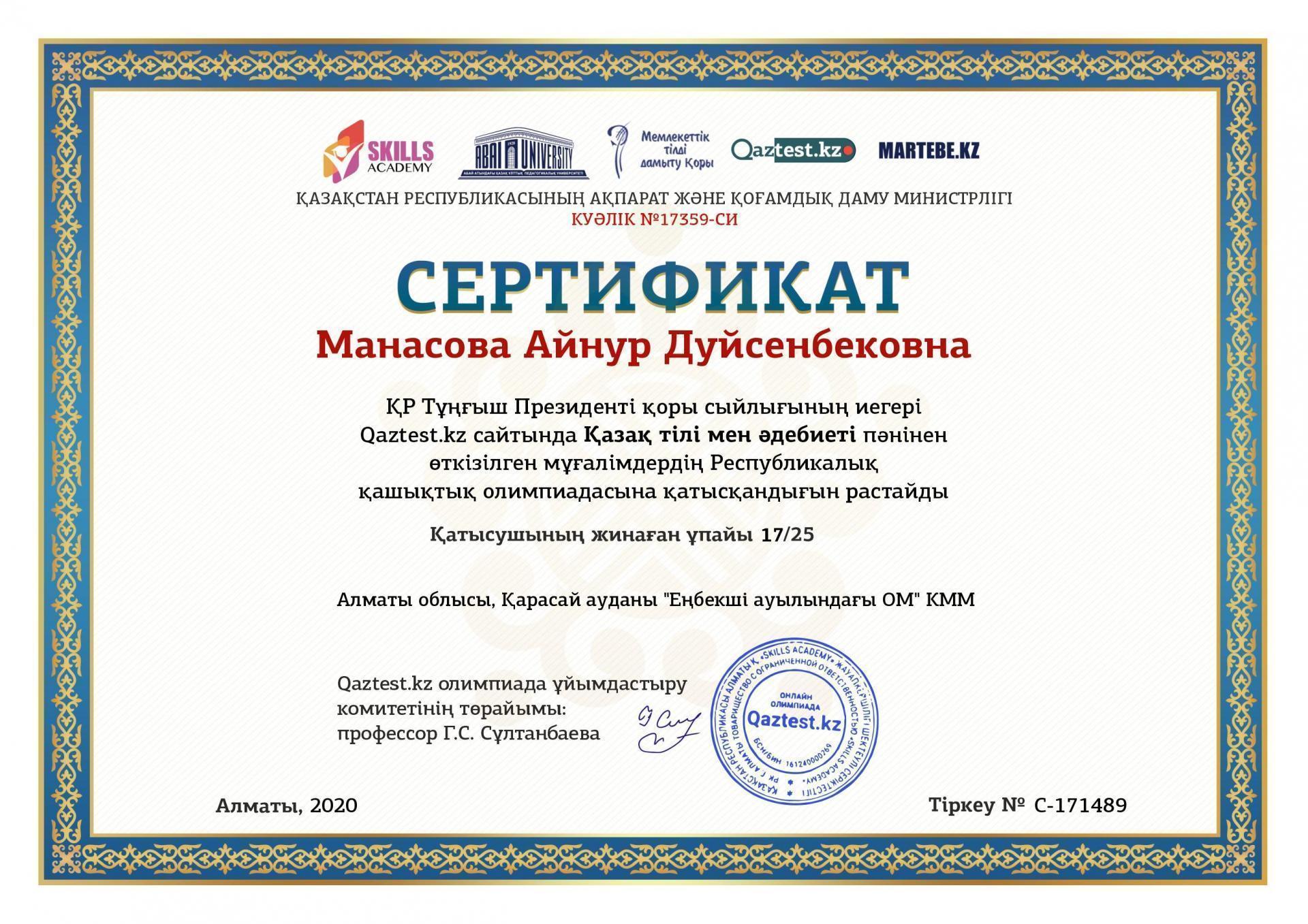 Қазақ тілі мен әдебиет пәні бойынша Qaztest қашықтықтан олимпиада » Еңбекші ауылындағы ОМ