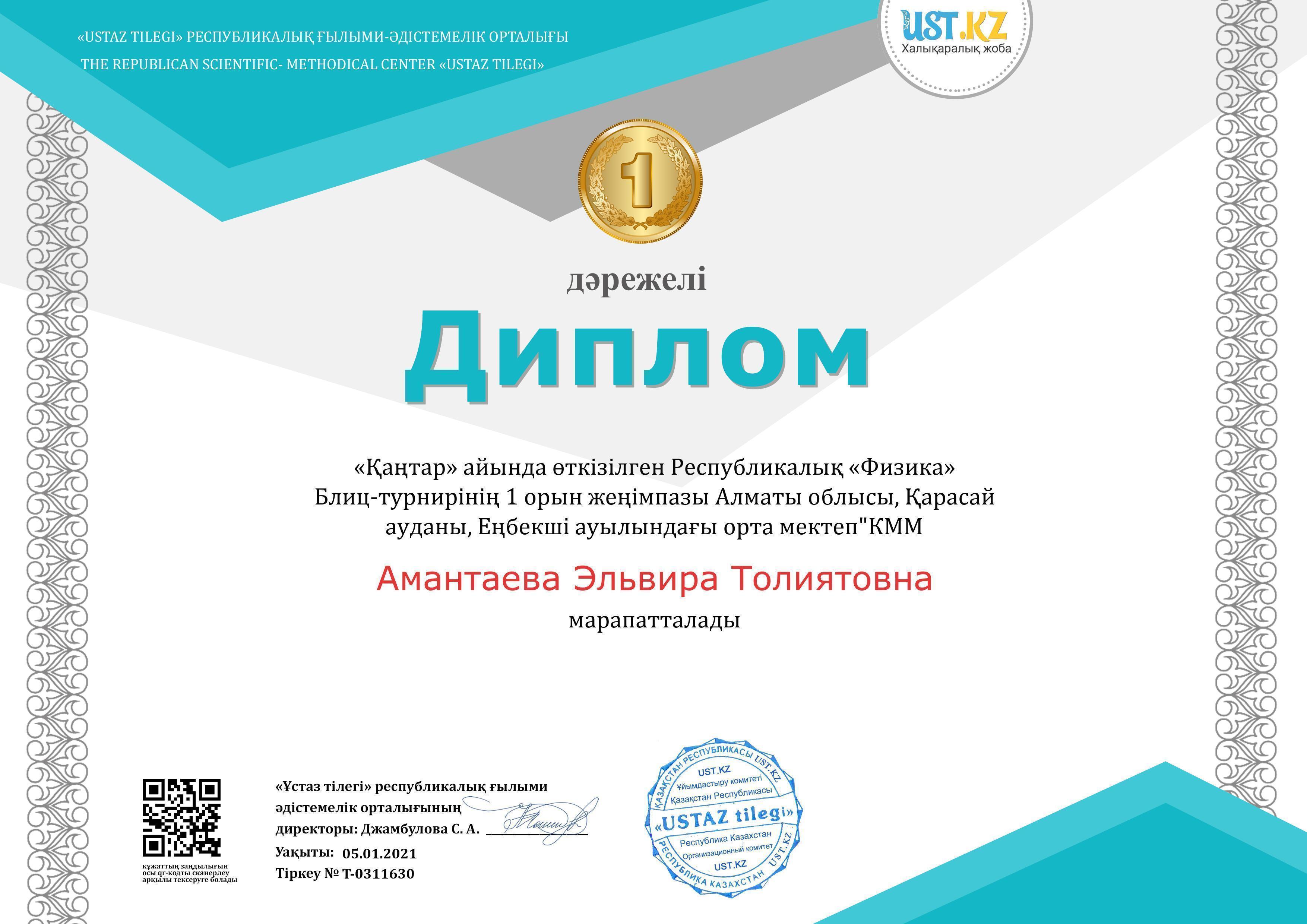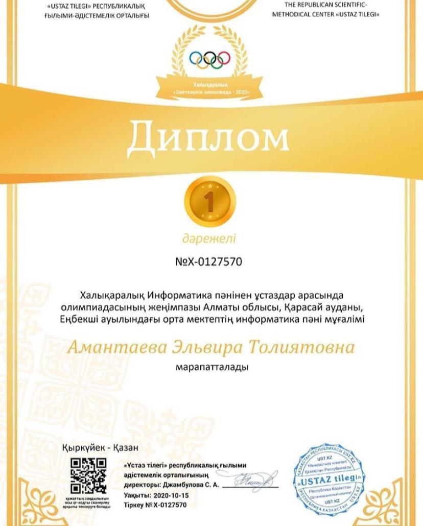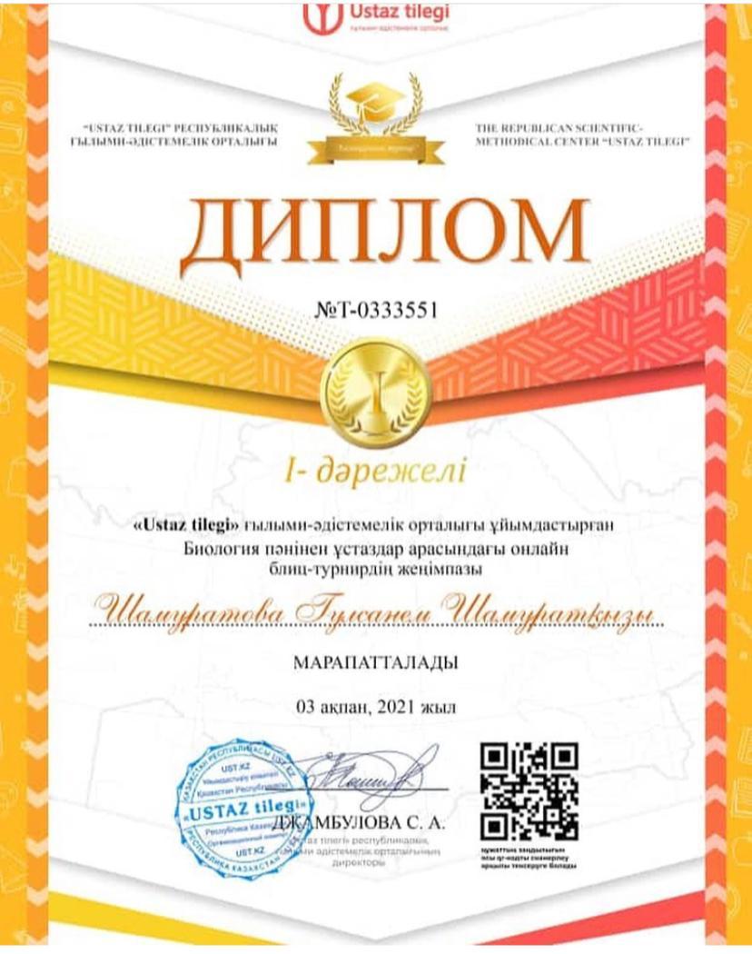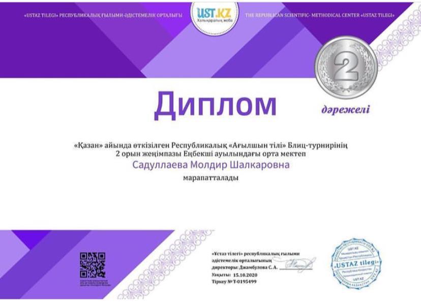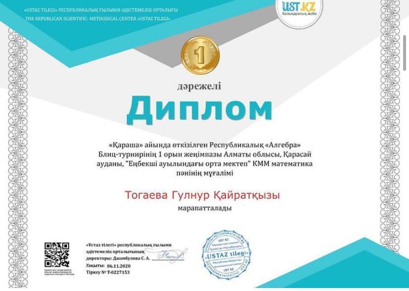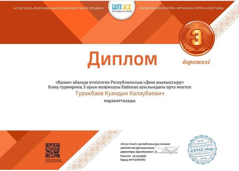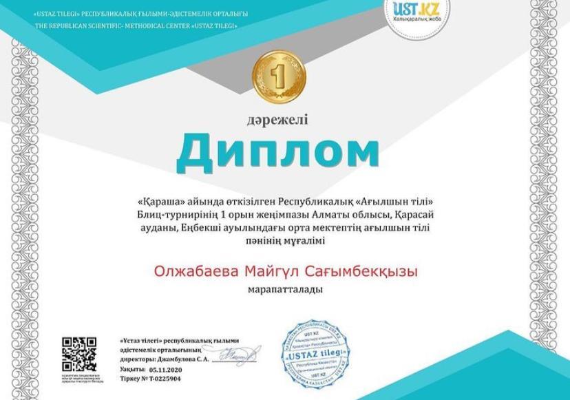 06 февраль 2021 0 1 2 3 4 5 "Ustaz tilegi"ғылыми-әдістемелік орталығы ұйымдастырған пәндер бойынша олимпиада жеңімпаздары